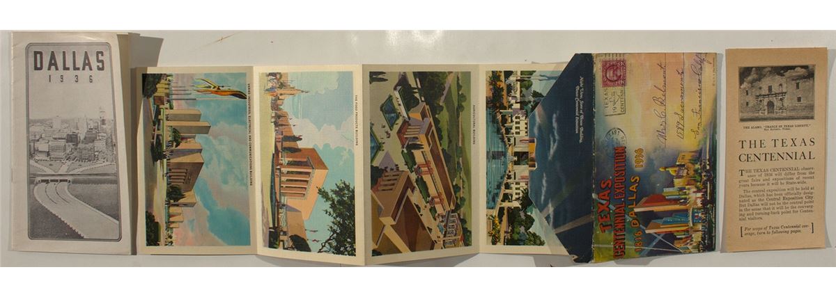 Three items from this World's Fair celebrating the 100th anniversary of Texas's independence from Mexico. 1) "Dallas, 1936" 16 page staple-bound booklet highlighting the city. A.H. Belo Corporation. Also, a 1935 pamphlet also put out by Belo, discussing the centennial and listing attractions all over the state. 6.75" x 3.75" 2) Souvenir booklet containing 18 color postcard-sized views of the expo. Mailed with expo. cancel. (Prag Collection)