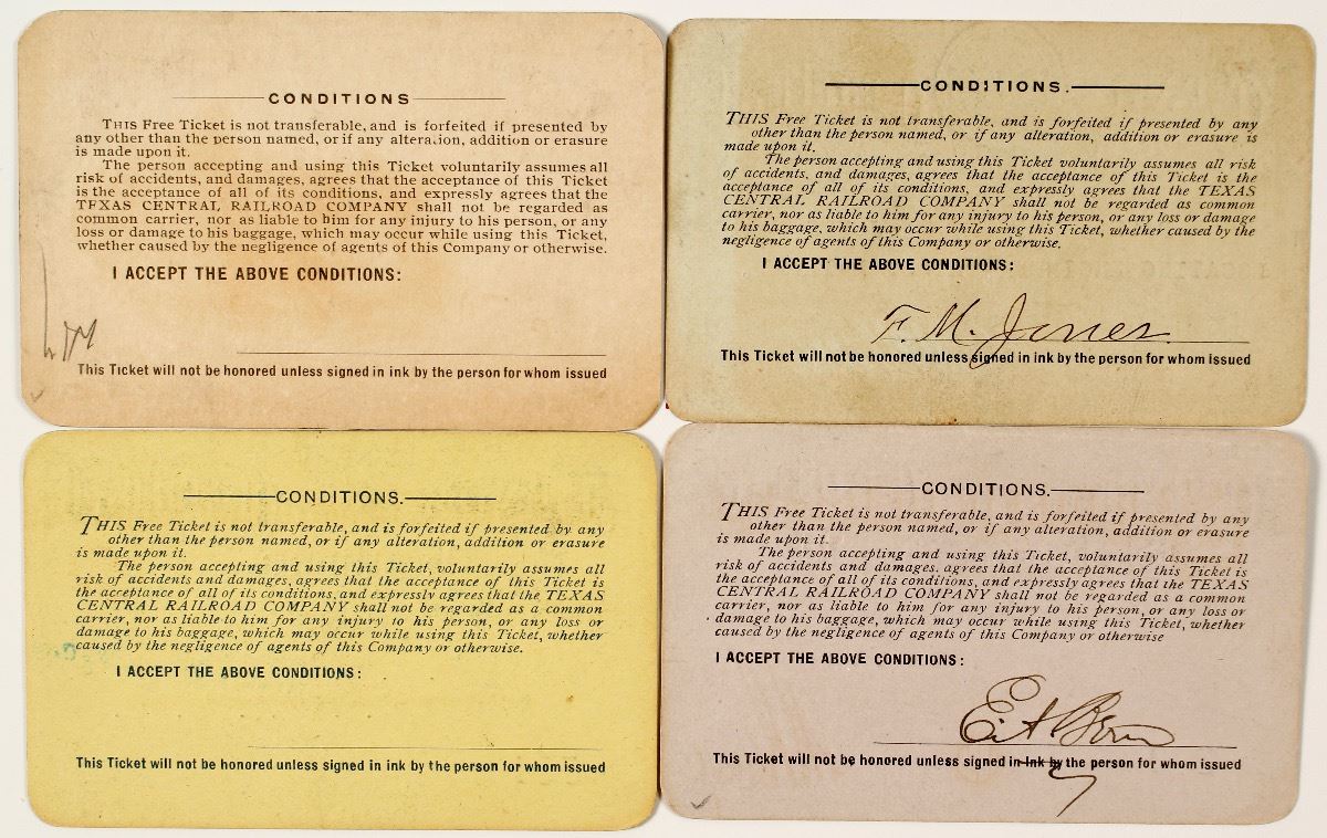 Lot of 4 different for the Lone Star Line. Included: 1899 to Edward A. Bern (supt. of the Canada Cattle Car Co.); 1900 to J.S. Jones (Fort Worth & Rio Grande Railway); 1907 to F.M. Jones (AT&SF); and 1911 to T.J. Anderson (Sunset Route). All on cardstock. (Prag Collection) City: State: Texas Date: Inventory# 41014