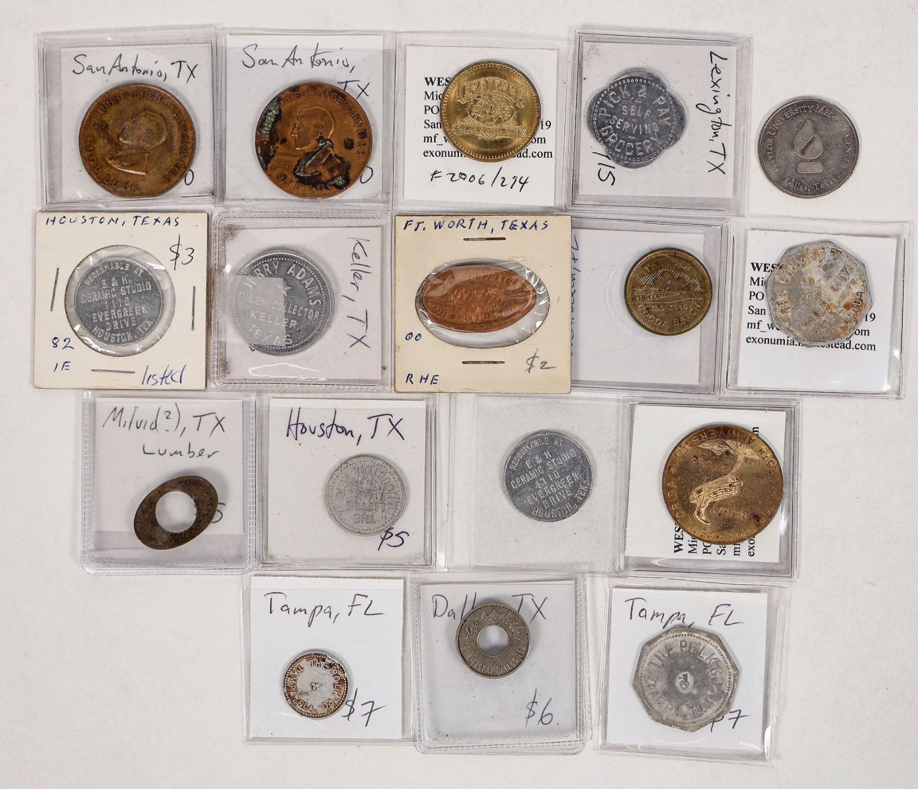 Seventeen tokens from Texas and Florida. Florida: Tampa, Orlando, Ft. Pierce, Haines City, Cocoa Beach. Texas: Houston, San Antonio, Dallas, Lexington, Keller, Fort Worth.