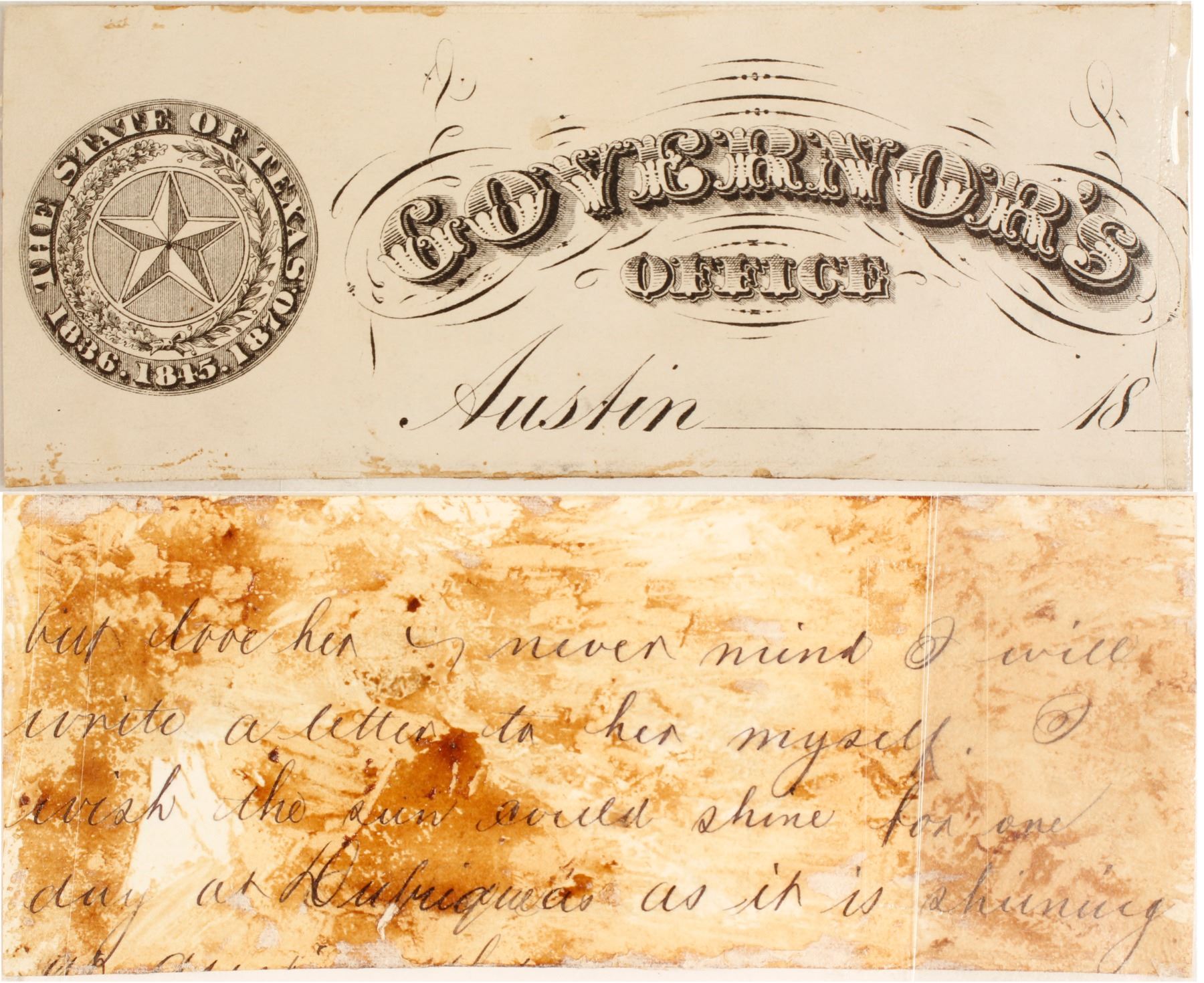 Snippet of Texas Governor's letter head with state seal. Some writing on reverse, heavily toned. Approx. 2 x 4.75". Texas Austin c1860s Ken Prag Collection