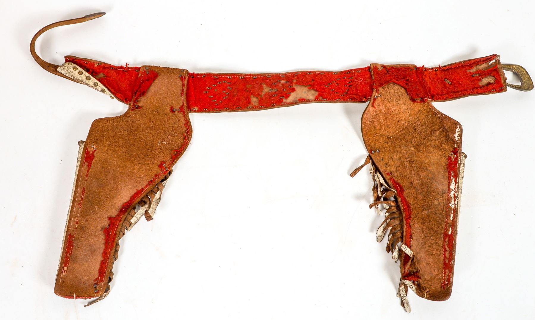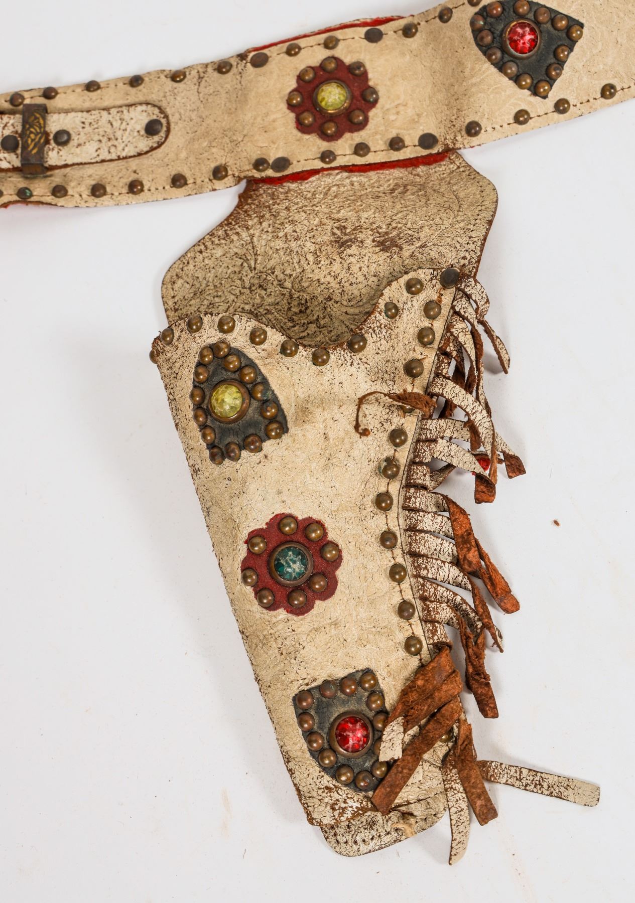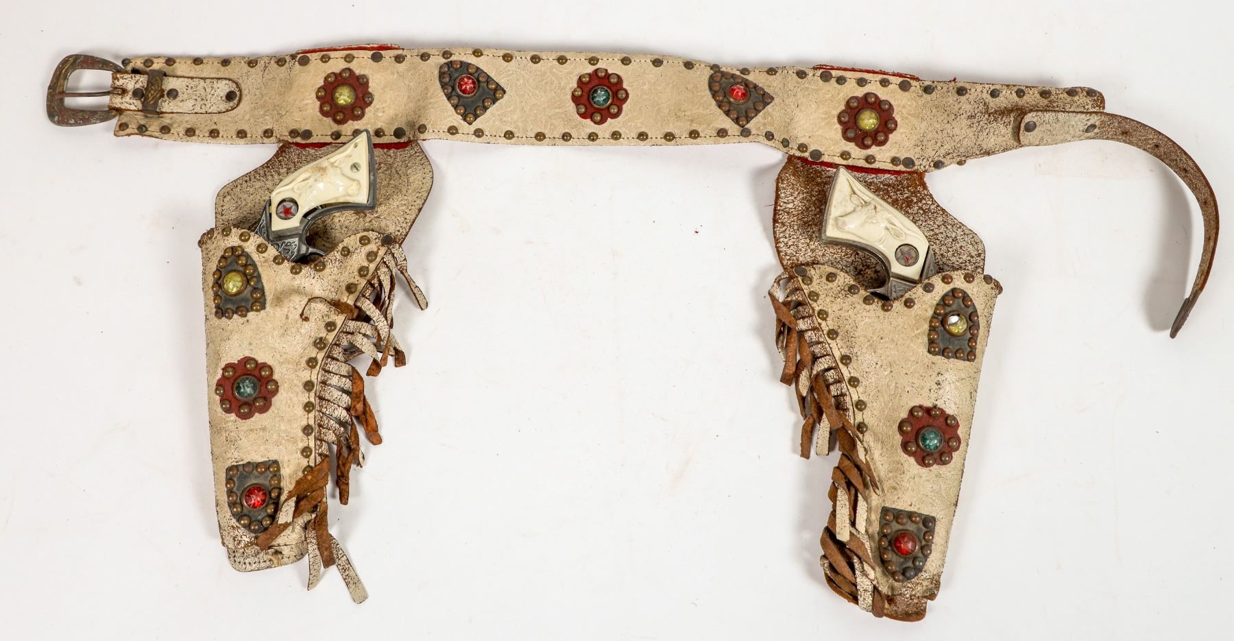 This is a "Texas Jr" two cap gun set with cream colored leather holsters and belt. There are conchos in yellow, green, and red jewels. The guns match with poor fitting plastic grips. One gun works well the other not. There is a red felt backing to the belt and holsters have fringe. Please see photo for details.