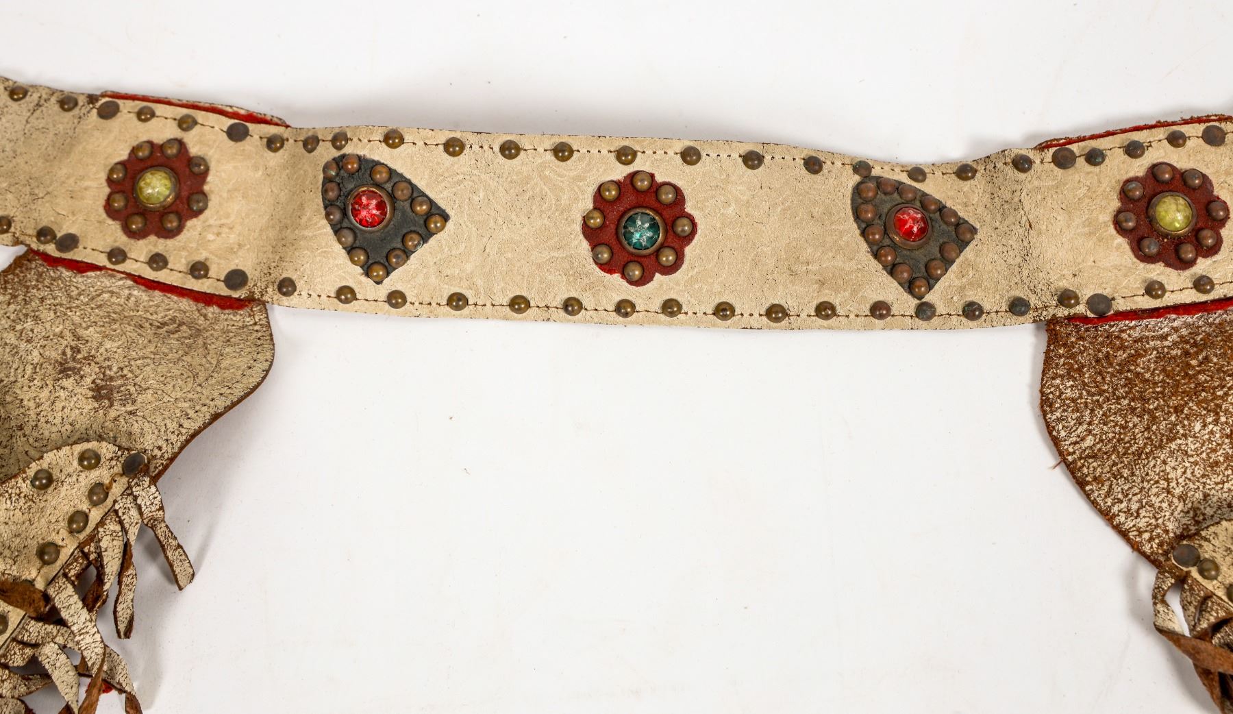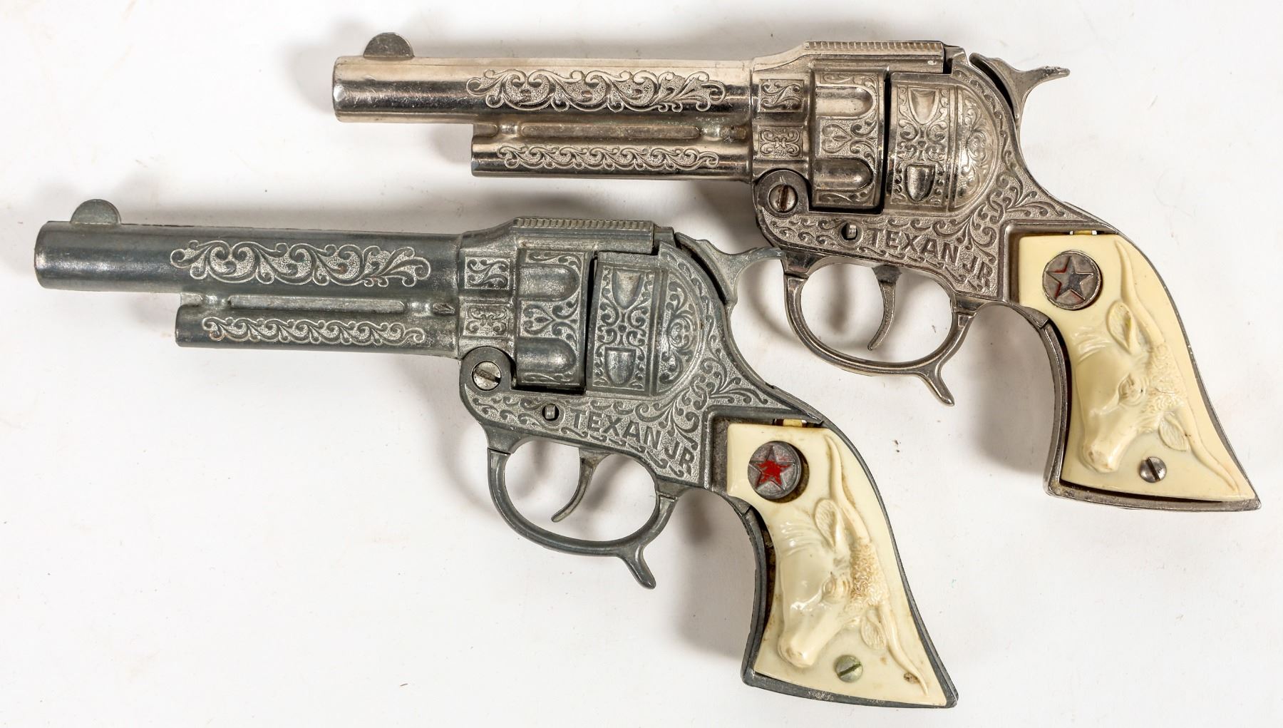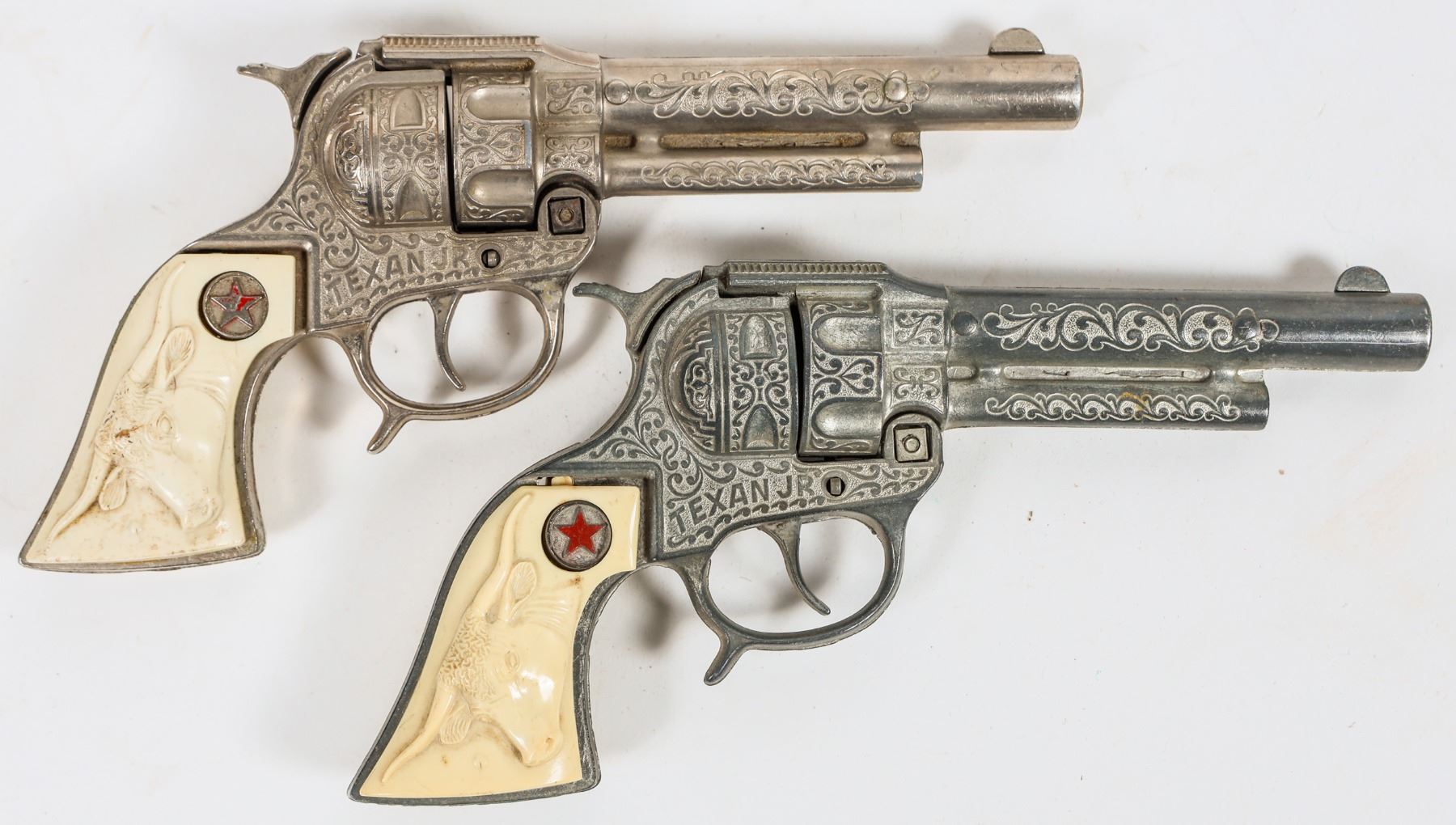 This is a "Texas Jr" two cap gun set with cream colored leather holsters and belt. There are conchos in yellow, green, and red jewels. The guns match with poor fitting plastic grips. One gun works well the other not. There is a red felt backing to the belt and holsters have fringe. Please see photo for details.