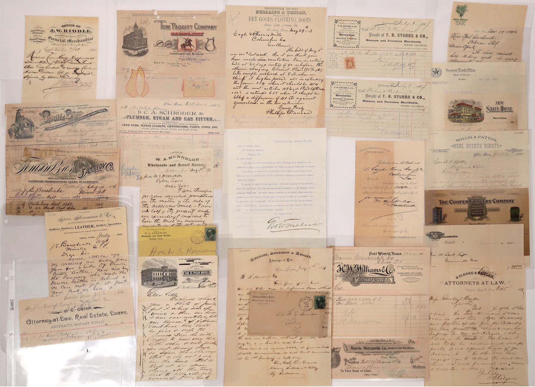 23 Texas letterheads, some pictorial, c. 1864-1910. Beeville, Dallas, Eagle Pass, Ft. Worth, Bonham, Waco, Galveston, Terrell, Austin, El Paso.
