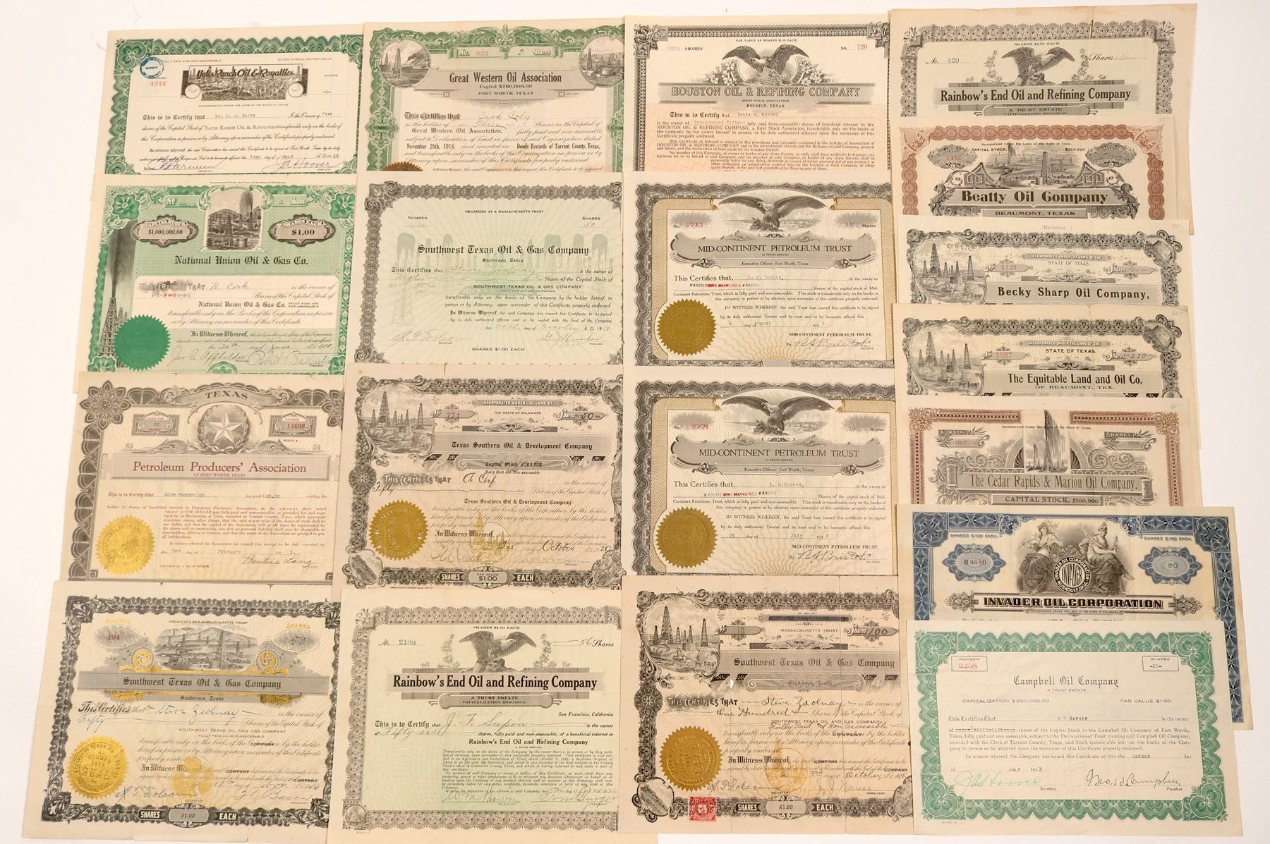 Lot of 19 pieces (17 Texas, 2 Oklahoma). Included: Cedar Rapids & Marion Oil Co. (1902); Equitable Land & Oil Co. (1902); Becky Sharp Oil Co. (1902); Beatty Oil Co. (1902); Campbell Oil Co. (1923); Rainbow's End Oil & Refining Co. (1920, 1922); Southwest Texas Oil & Gas Co. (1915, 1916, 1919); Mid-Continent Petroleum Trust (1923); Houston Oil & Refining Co. (1919); Texas Southern Oil & Development Co. (1920); Great Western Oil Assoc. (1919); Petroleum Producers' Assoc. (1923); Yates Ranch Oil & Royalties (1928); National Union Oil & Gas Co. (1918); and Invader Oil Corp. (1921). Nearly all pictorial. Fair to good condition. Please inspect. Ken Prag Collection