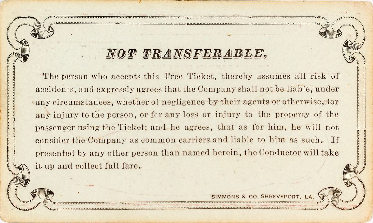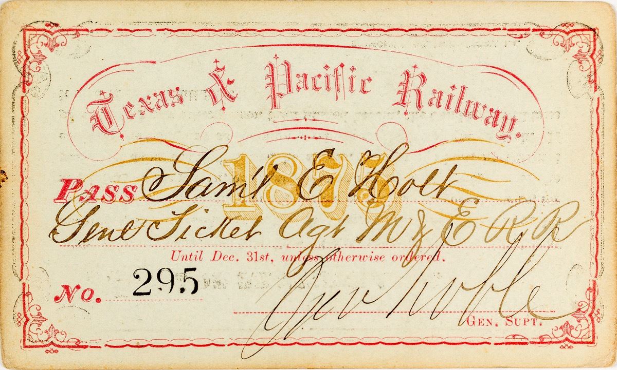 No. 295, issued for 1875 to Samuel E. Holt, general ticket agent for Montgomery & Eufaula Railroad. Signed by George Noble as general superintendent. Printed on cardstock with red font by Simmons & So., Shreveport, LA. Some soiling and toning. (Prag Collection) City: State: Texas Date: Inventory# 39354