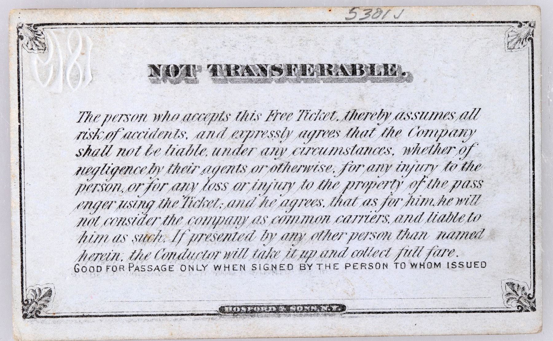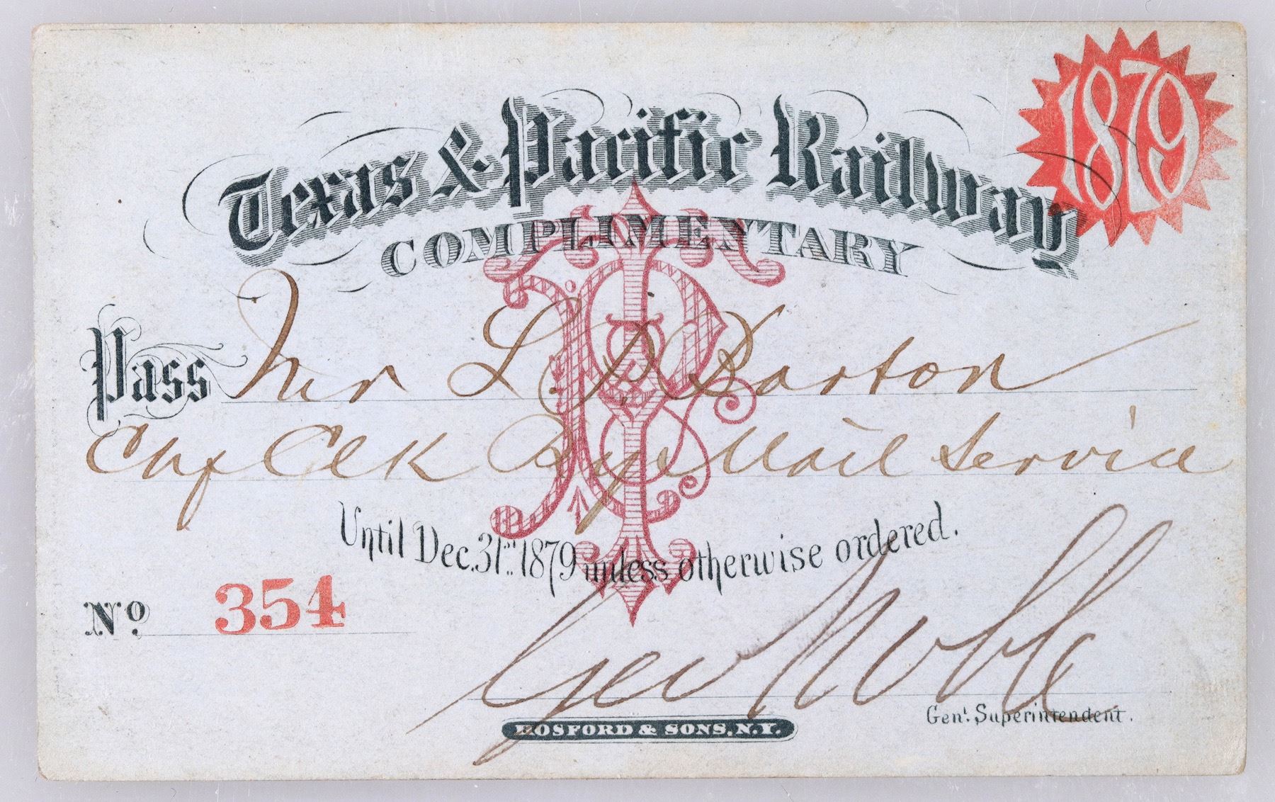 #354 issued 1879 to L P Barton, Complimentary, signed Gen. Supt., blue card stock, "T&P" red underprint center of pass, "1879 " upper rt corner red starburst print, Hosford & Sons printer. Chartered 1871 to build from Marshall Texas to San Diego, Cal. Failing financially, In 1879 Jay Gould organized a syndicate to financially back the RR to continue construction eventually reaching Sierra Blanca but not before SP which resulted in a lawsuit "Gould-Huntington Agreement" of 1881. T&P never made it to Calif. RR continued until merged in 1976 w/Missouri Pacific.