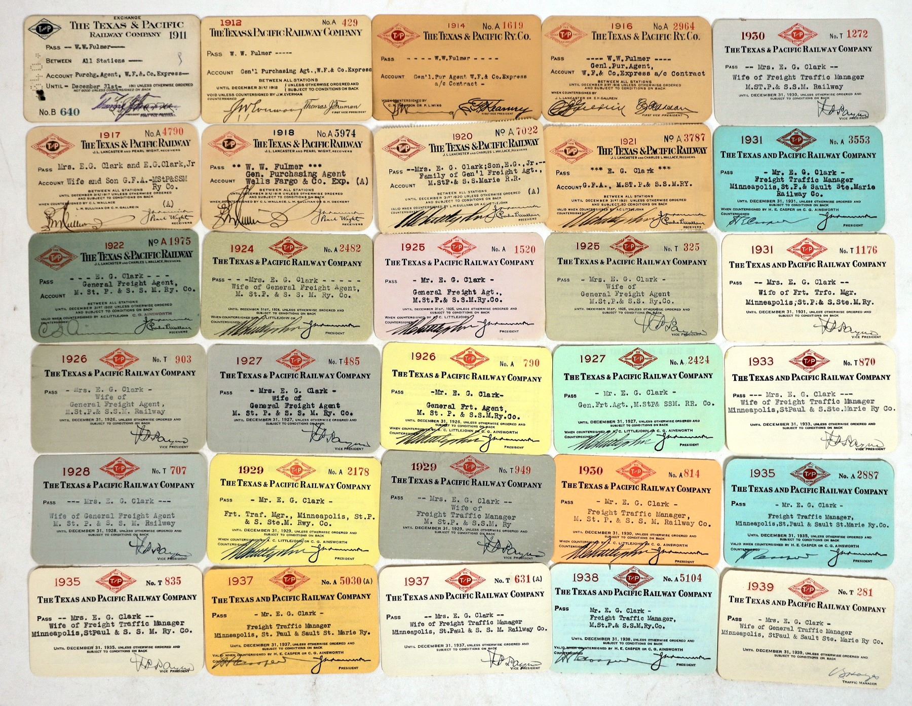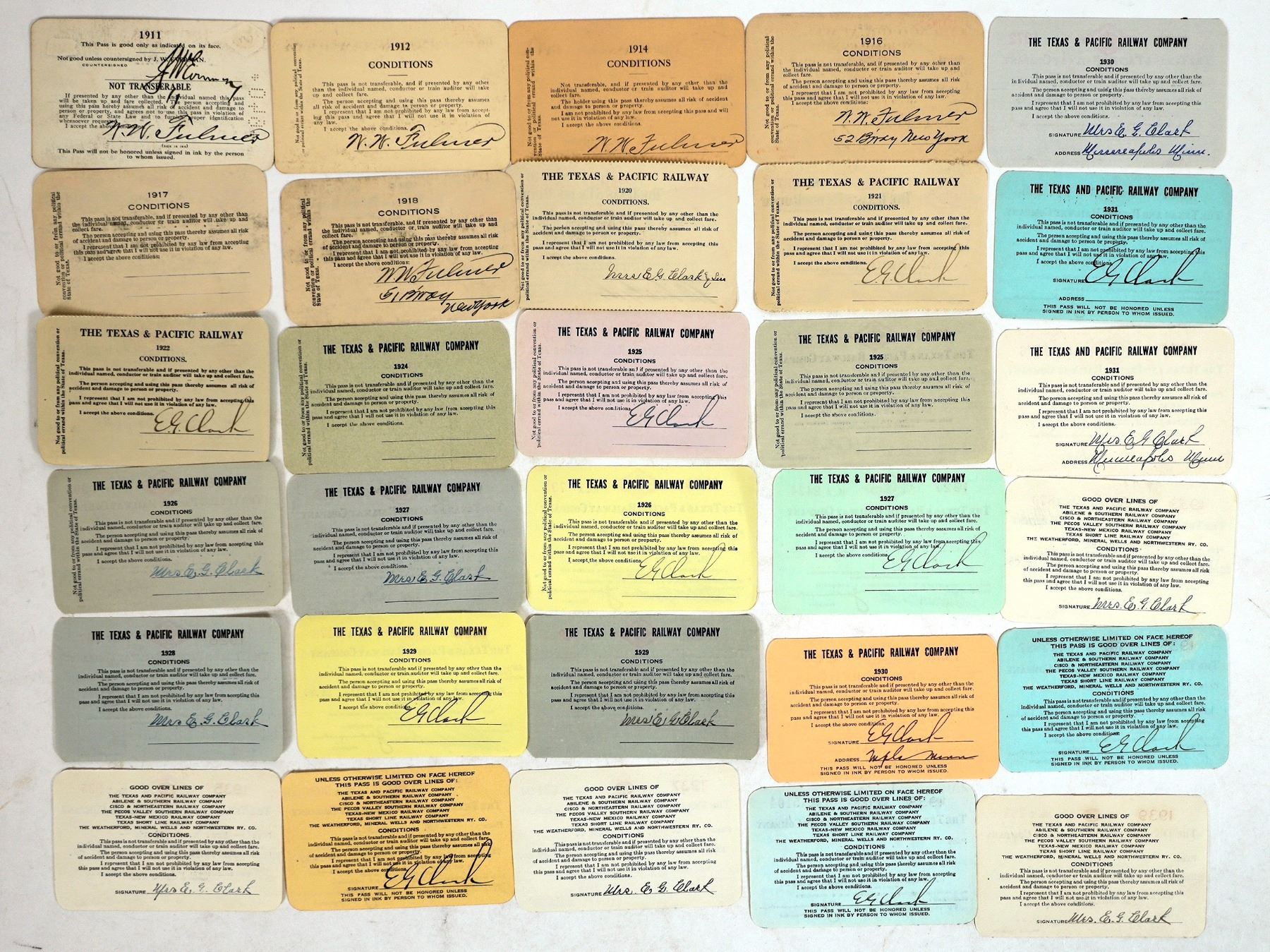 Group of 30 railroad passes from the Texas & Pacific Railway Company. Passes date from the early 1900s; see photos for specific years and additional detail.