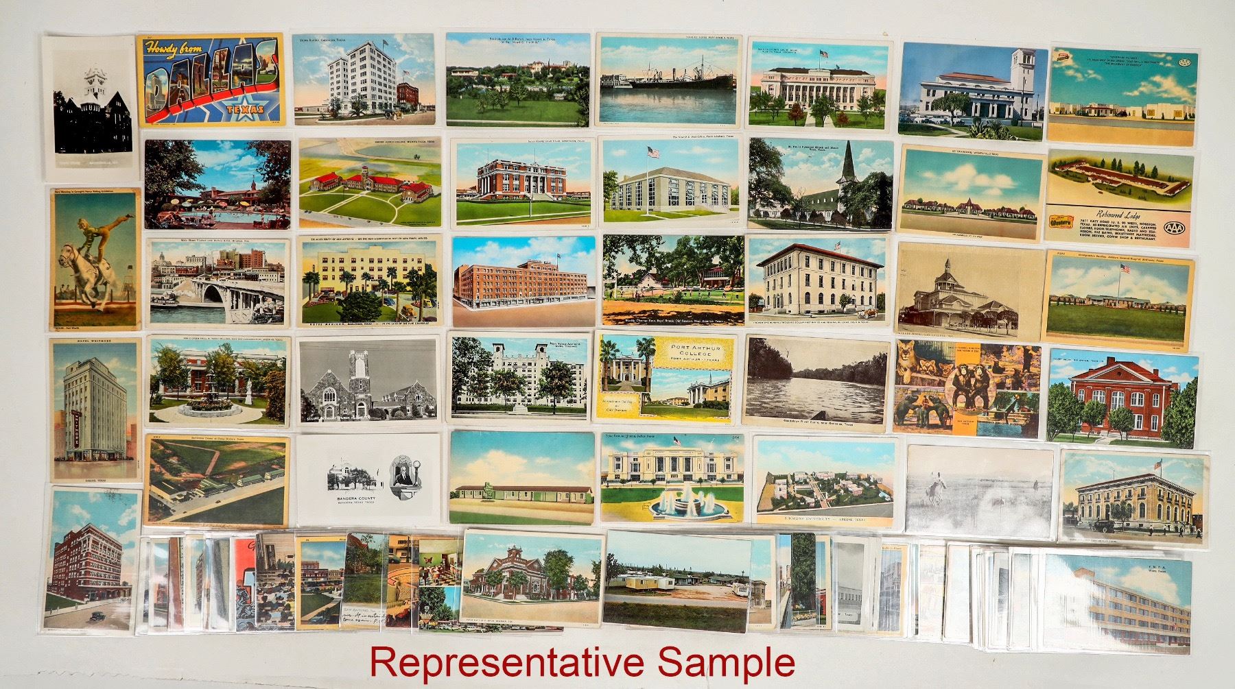 Great group of 240 Texas postcards, c.1908-1950s. This is an ex antique dealer's stock from an antique mall in Austin. Perhaps only a dozen or so real photo. Mostly early printed, linen, and more modern cards. Instant collection! Please inspect for goodies and details.