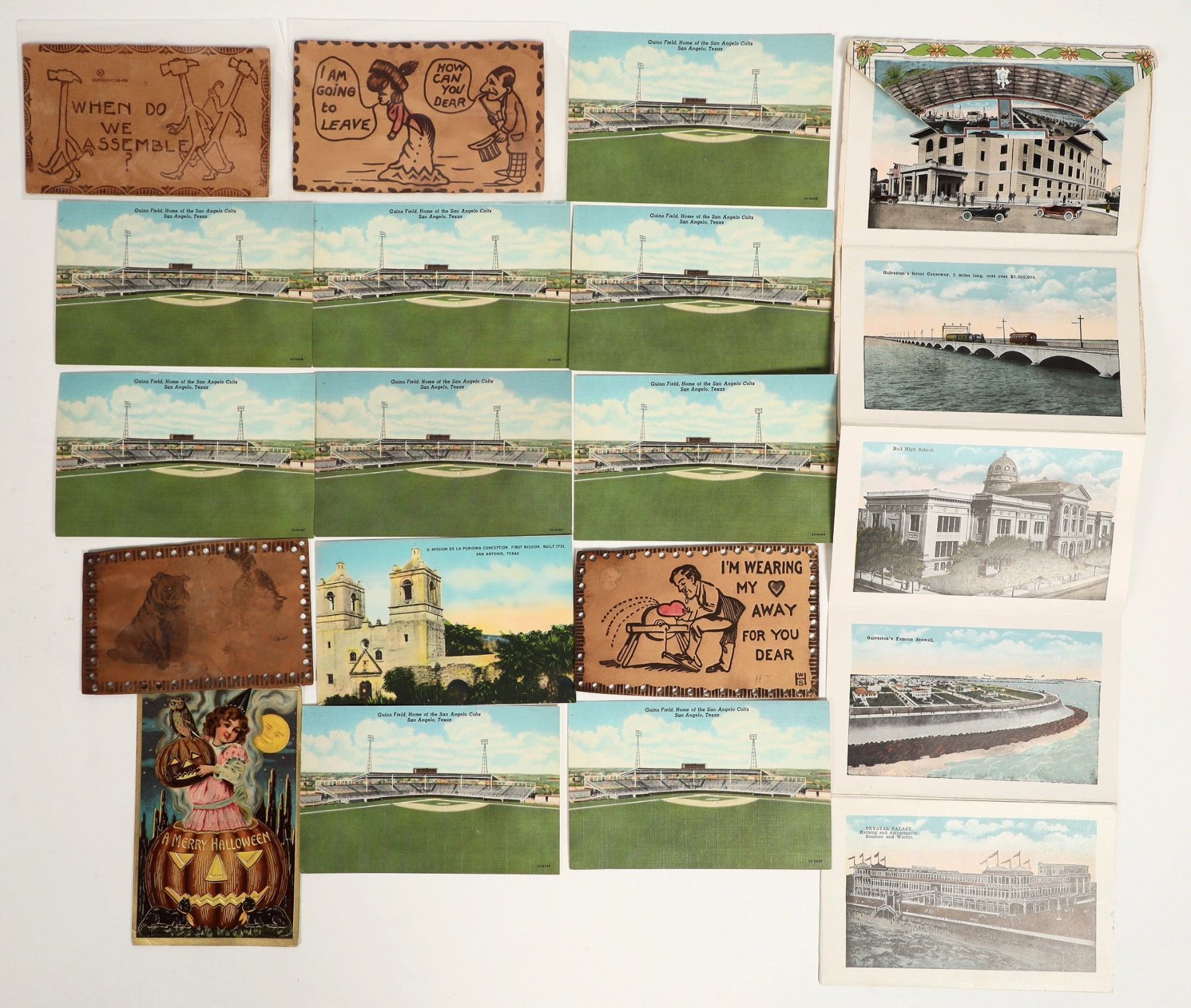 Multiple different postcards from the state of Texas. Includes leather and Halloween postcards. About 15 postcards.