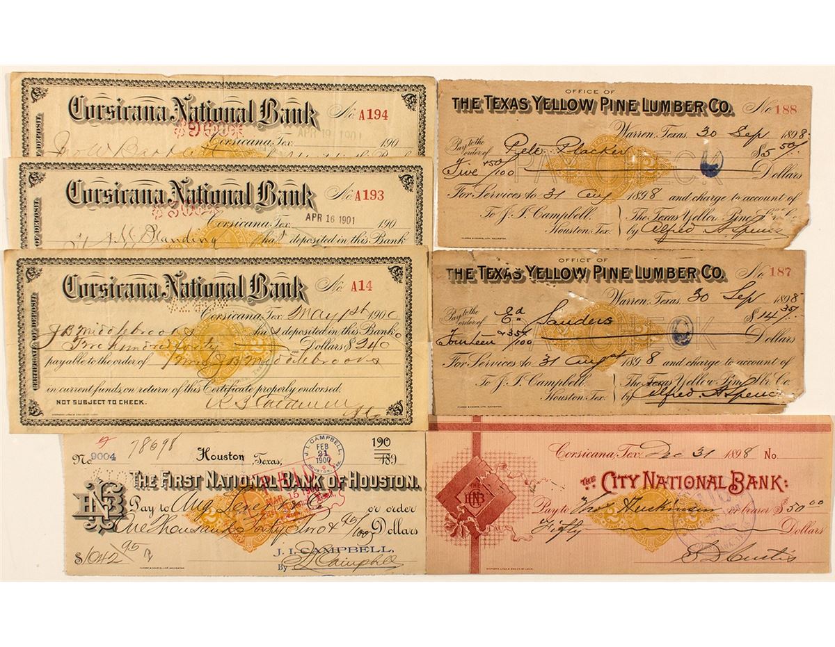 Lot of 7. 1) Three Corsicana National Bank deposit certificates (RN-X), 1900-1901. 2) First National Bank of Houston (RN-X), 1900. 3) The City National Bank (RN-X), Corsicana, 1898. 4) Two Texas Yellow Pine Lumber Co. checks (RN-X), Warren, 1898. (Prag Collection)