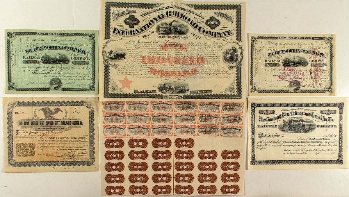Lot of five. 1) Unissued, but very attractive $1,000 bond for The International Railroad Company with four vignettes (locomotive, cowboys, etc). 1871. 76 coupons. 28" x 16" Continental Bank Note Co. 2) Three different stocks for The Forth Worth & Denver City Railway Company. Issued 1896 (punched), 1899 (punched) and 1921 (stamp cancelled). Three different vignettes. 3) Unissued 18-- stock for The Cincinnati, New Orleans and Texas Pacific Railway. Nice vignette of locomotive. (Prag Collection) City: State: Texas Date: 1871-1921 hwac# 34505