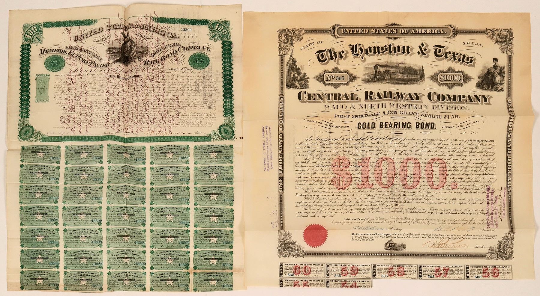 1) #13399 39200 authorized, issued/paid, $100 6% First Mortgage Land Gold bearer bond due 1890. Issued Dec. 23, 1868. President signature not readable. Vignette Columbia and Globe above wavy title. Handwritten in red explanation of bond being "PAID". 35 coupons attached. VF. 2) Waco & Northwestern Division . #565, issued/paid, $1000 7% 20 yr. First Mortgage Land Grant Sinking Fund Gold bearer bond due 1903. Issued June 20, 1873. Signed W.E. DODGE President. BLACK , embossed red seal w/Texas star center, Vignettes: Bottom, train rounding curve. Top left Indians looking r-l. Center 4-4-0 train passing lake. Right woman seated holding wheat bale looking r-l. $1000 red underprint. 7 Coupons attached. Cowan McClure & Co. printer.