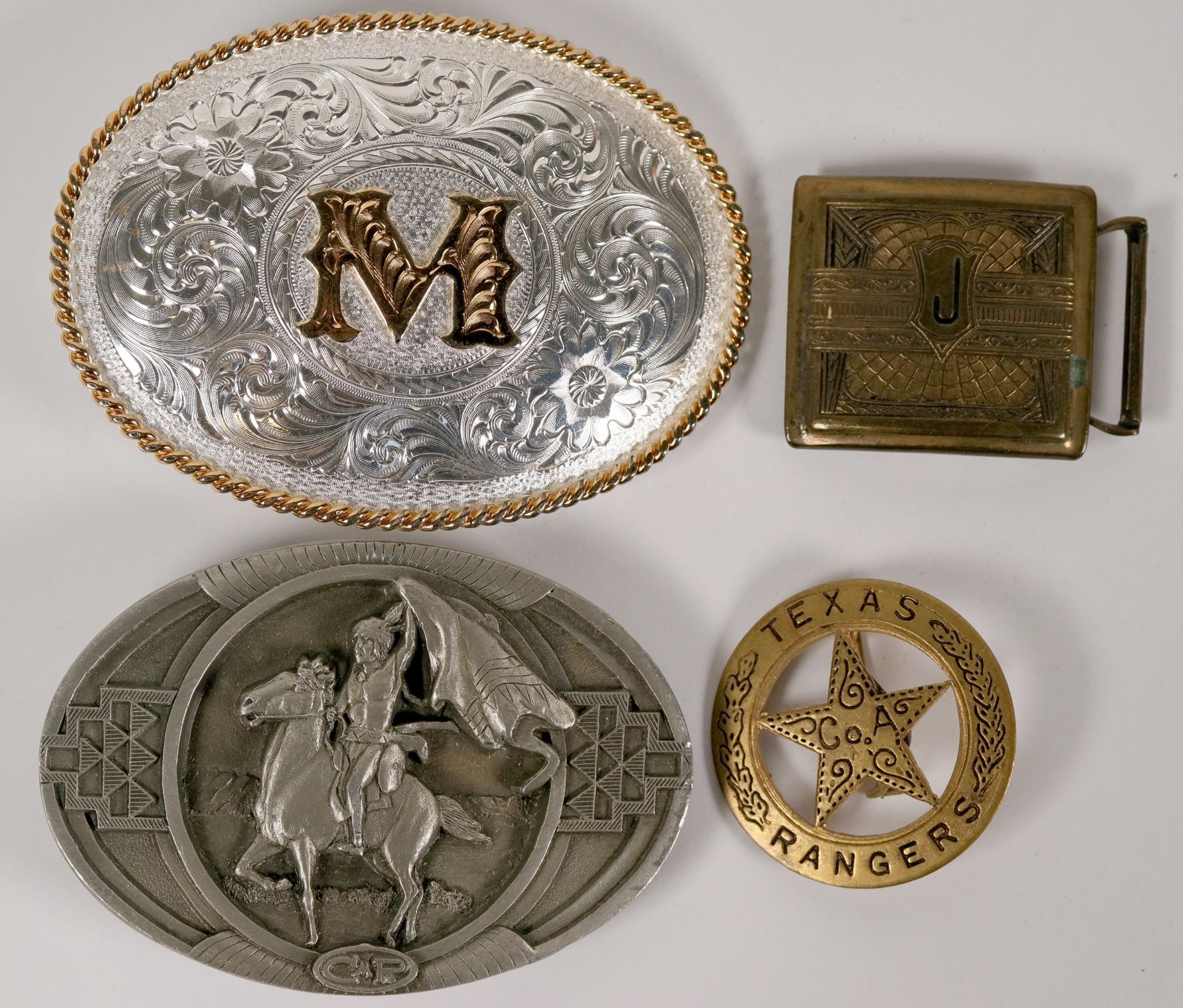 Lot of 2. 1) This is a gold mini badge which is a smaller, lightweight versions of some of the Old West replica badges. 2) Belt buckle. Letter "J" on front. Back shows Pat 12-13-21 Giant Grip Base Metal. French Silver plate. 3) Montana silver belt buck circa 1980-1990. Silver plate and gold plate. 4) Pewter 1991 C. and J. Ink belt buckle with Indian Signaling Design Charles Russel 1901 No. 1052 of 7500.