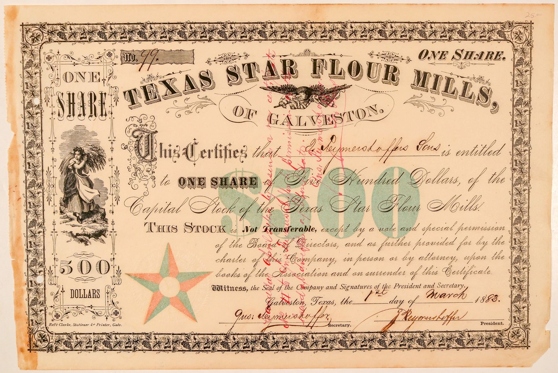 No. 99, issued for one share to I. Reymershoffer on March 1st, 1883 in Galveston. Signed by Reymershoffer as president and Jno. Reymershoffer as secretary. Pen and punch cancelled. Black border and print. Allegorical farming vignette. Blue and red star at bottom left. Printed by Robert Clarke, Galveston. Rough left border and other light wear. 8.25 x 12" Founded by John and Gustav Reymershoffer in 1879, the Texas Star Flour Mills was the largest plant of its kind. It could mill 125 barrels of flour a day with its 137 horsepower engine. Ken Prag Collection