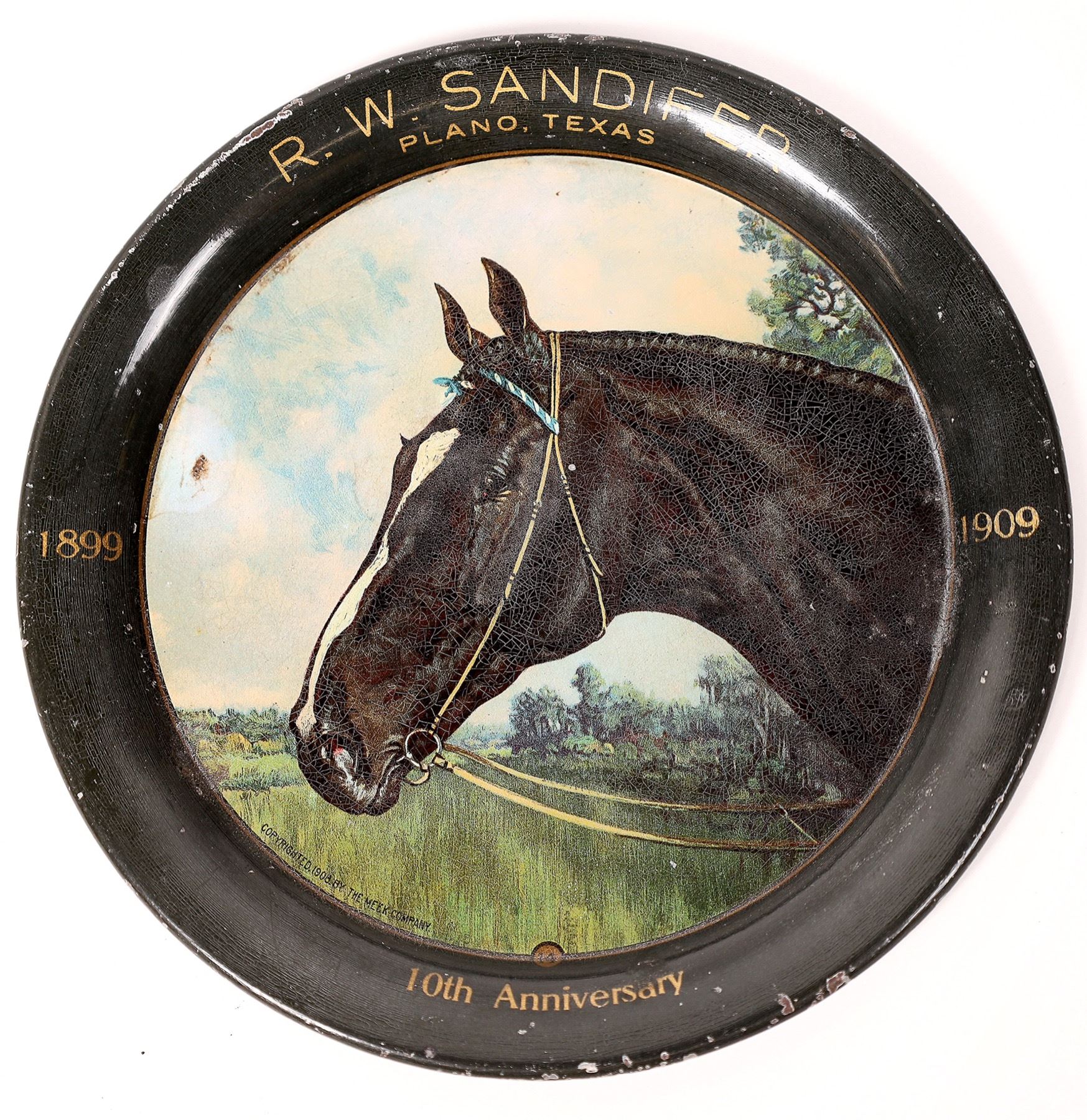 Tip tray with an image of a horse. The text around the outside says "R.W. Sandifer. Plano, Texas. 1899-1909. 10th Anniversary." There is also an engraving on the back that reads, "Francis to Katherine." Circular metal tray, approx. 4.25 inches in diameter. Good condition, some small chips.