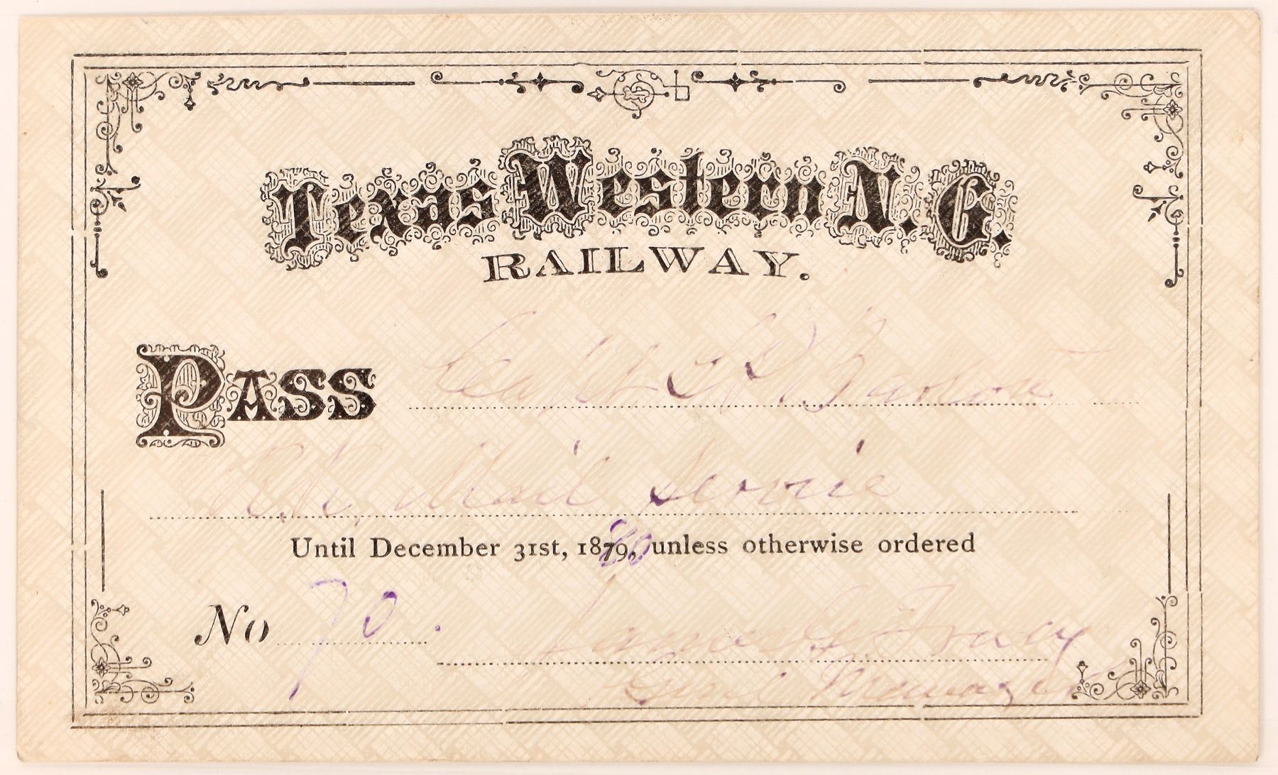 Rare. #70 issued 1880 to C R Baker, RR Mail Service, signed Gen Mgr, brn card stock, blk lettering w/ blk lined border w/ filigree design in each corner. Hand writing is light and hard to see, but it is there. The pass had orig. dateline 1879, “80” has been hand written over it. Unk printer. Chartered in 1875 from reorganization of Texas Western RY, operating between Houston and Pattison by 1877. In 1879 it was reorganized as the Texas Western RY Col Operated until 1896 and rails pulled by 1900. Texas Ron Lerch Collection