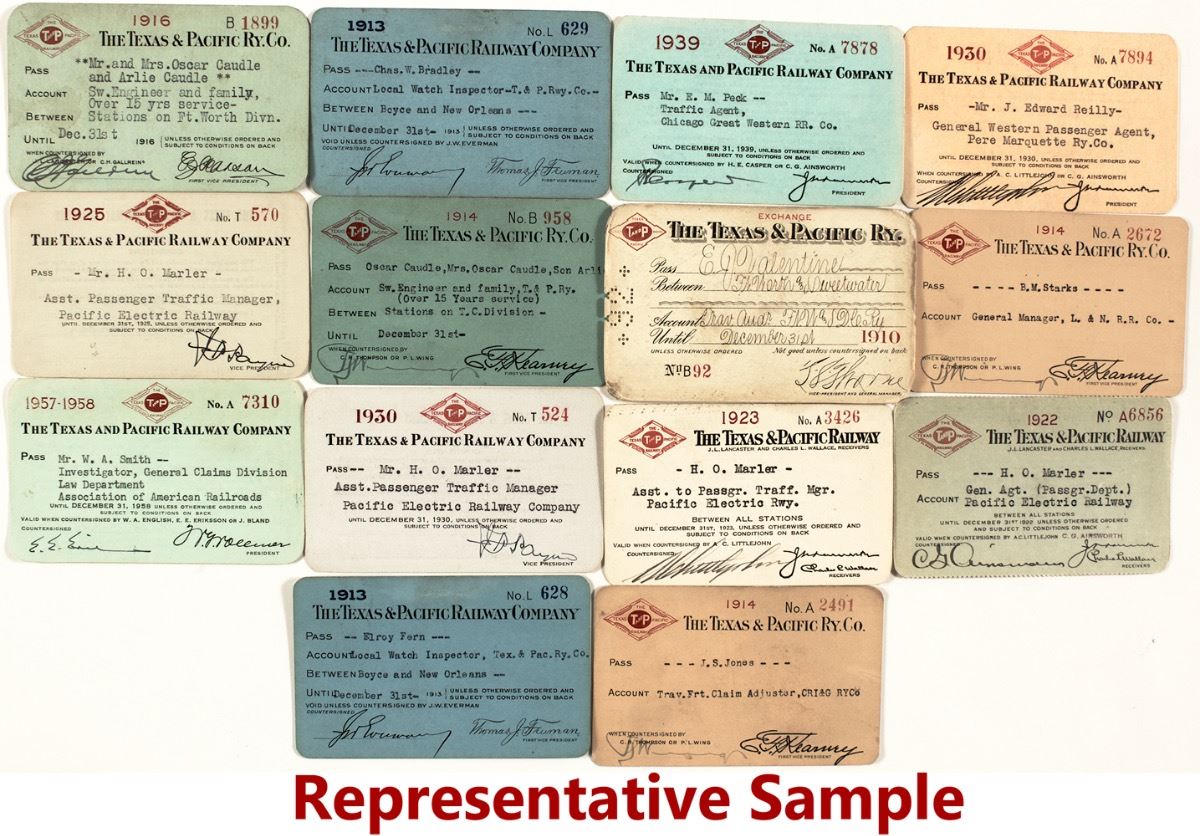 Fifty-two passes including duplicate years: 1910, 1913 (2), 1914 (3), 1916 (3), 1917, 1920, 1921, 1922, 1923, 1925 (3), 1926, 1927, 1928 (2), 1929 (2), 1930 (3), 1931, 1933 (4), 1935 (2), 1937 (3), 1938 (4), 1939 (4), 1941, 1943 (2), 1944, 1945, 1946-47, 1948, and 1957-58. Prag Collection City: State: Texas Date: hwac# 22353
