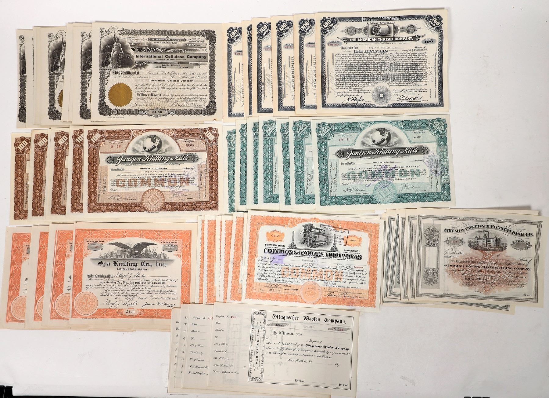 About 80 textile and construction stocks, 8 different, 1870's-1931 plus unissued. Chicago Cotton Mfg.,Intl. Cellulose, American Thread, Ottaquechee Woolen, Crompton & Knowles Wool Works, Spa Knitting, 2 styles on Jantzen Knitting Mills.