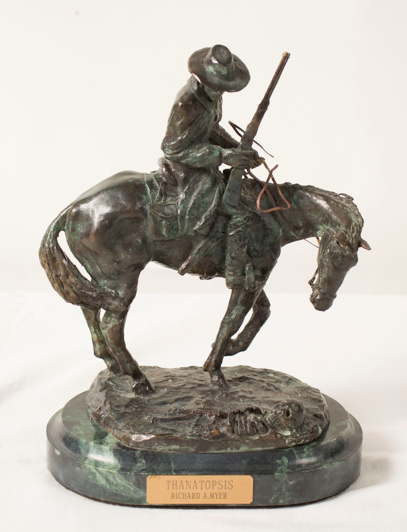 By Richard A. Myer, a member of the American Indian and Cowboy Artists. Bronze on marble base, H 10.5" W 7.5" D 5.5" "Thanatopsis" is a poem by the American poet William Cullen Bryant. Meaning 'a consideration of death', the word is derived from the Greek 'thanatos' (death) and 'opsis' (view, sight). It is considered a milestone in American poetry and here has been given a Western theme. The final stanza reads: