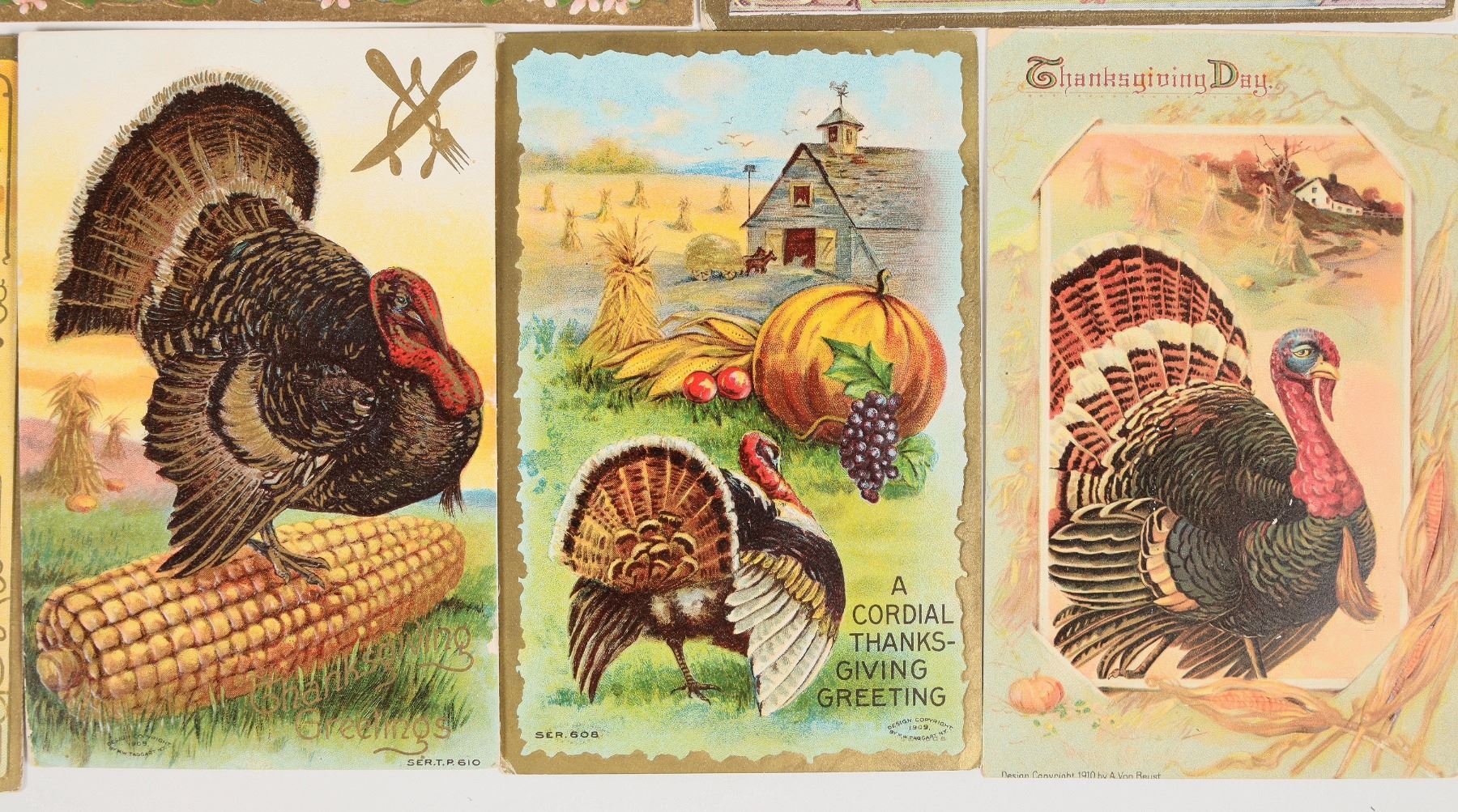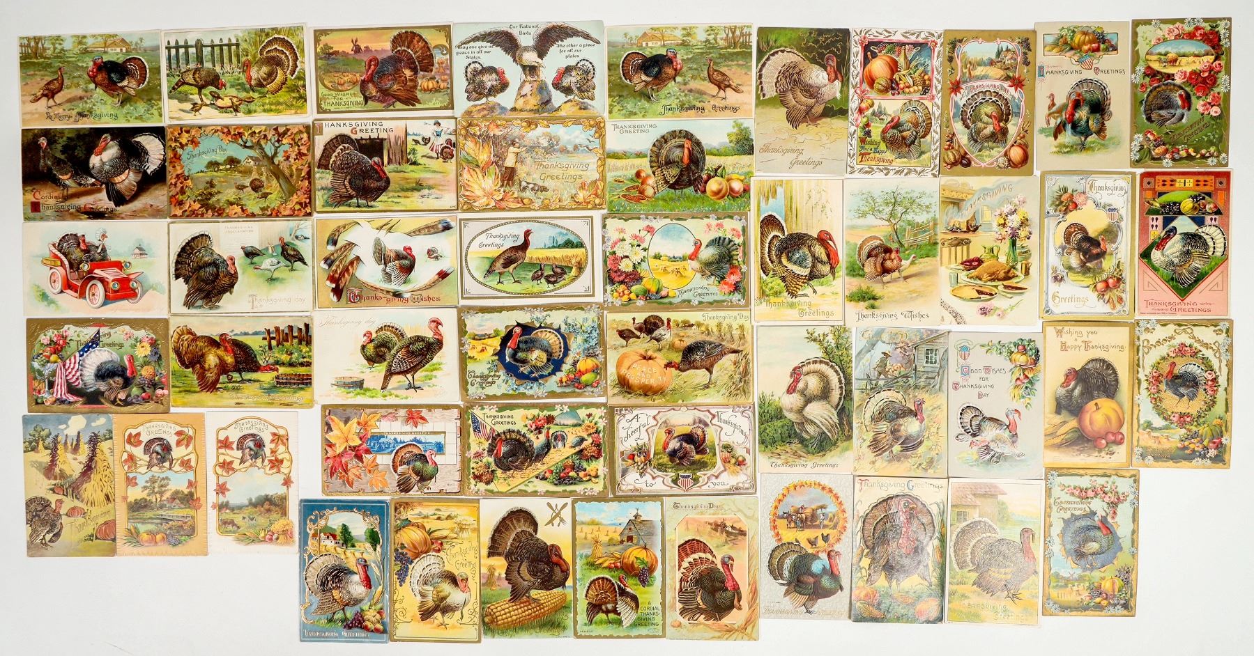 Thanksgiving/Turkey Day, vintage turkey pictorial embossed postcards, no duplicates (group of 50). 1907-1918. Good condition, see photo. Measure 3.5x5.5".