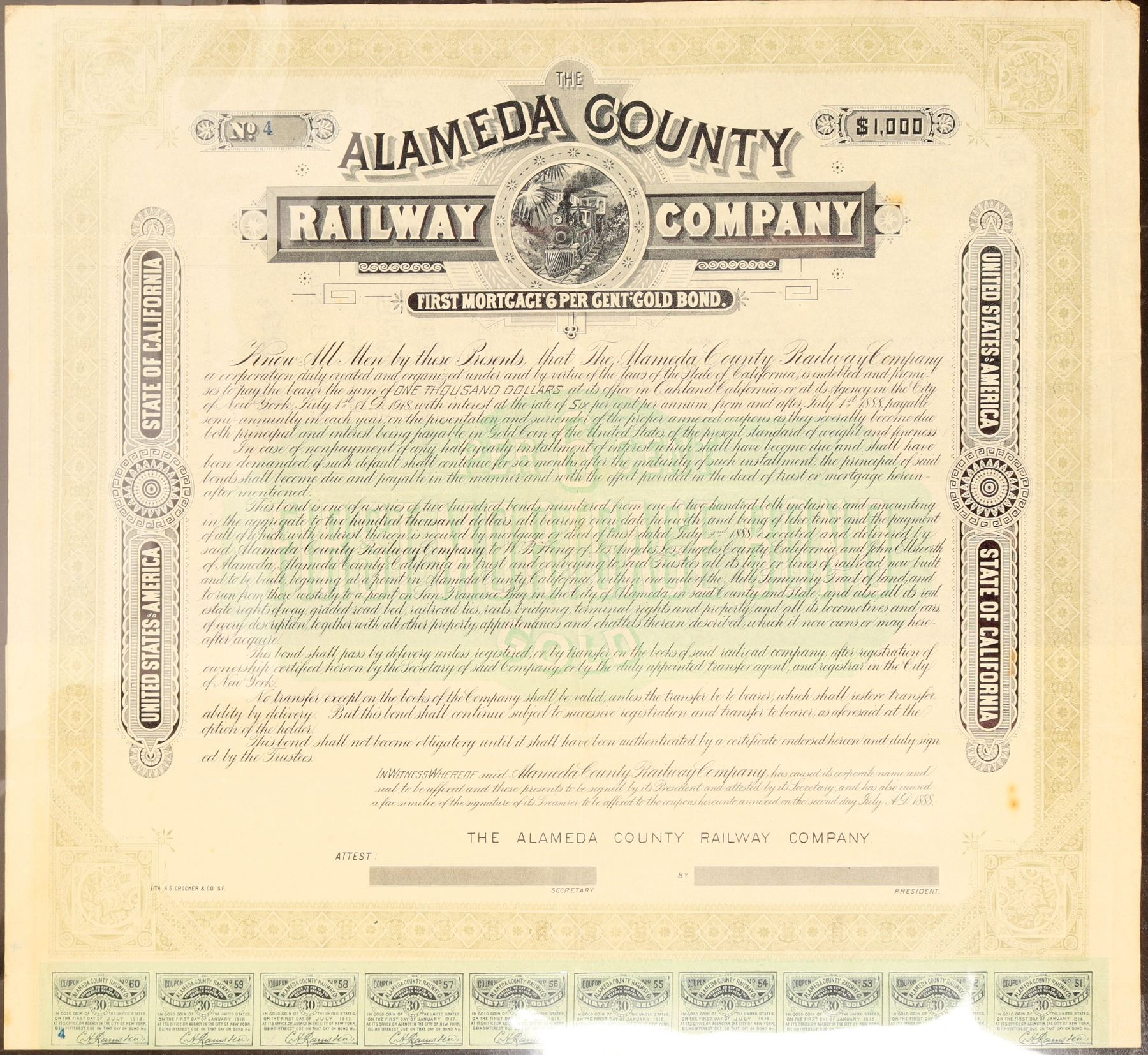 #4, U/U, $1000 6% First Mortgage Gold bearer bond. Dated July 2, 1888. GREEN, vignette 4-4-0 passing through countryside inside circle w.wavy title above. "6% GOLD FIRST MORTGAGE BOND" in outlined green underprint, coupons attached none missing, H.S. Crocker & Co printer. Between VF-EF condition, no tears or holes, shows light evidence of folding. Kept in plastic in hard cover binder. Not in Cox and internet search in other top stock collectibles did not list any, This maybe the only one known. Ken Prag Collection