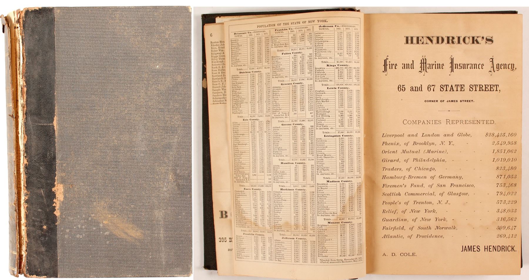 The Albany Directory for the Year 1876, The Centennial Year Containing a General Directory of the Citizens, Business Directory, Record of the City Government, Its Institutions, &c., &c. Published by Sampson, Davenport & Co., 1876. 432 pages plus ads. There is some damage to binding along the spine and edges, and water staining. State: New York City: Albany Date: 1876
