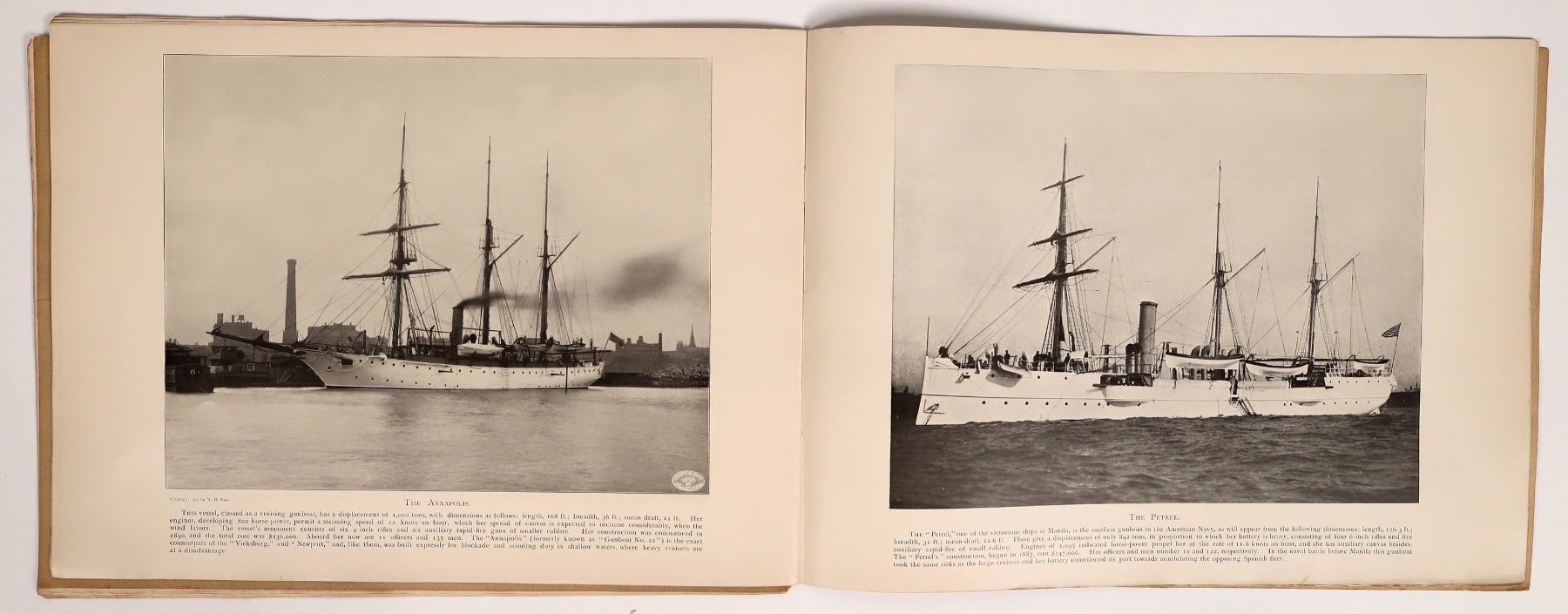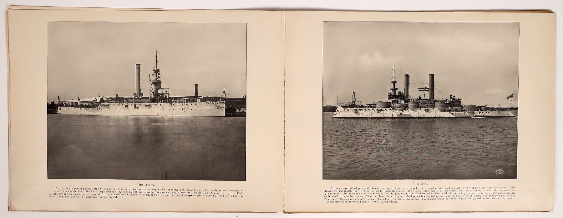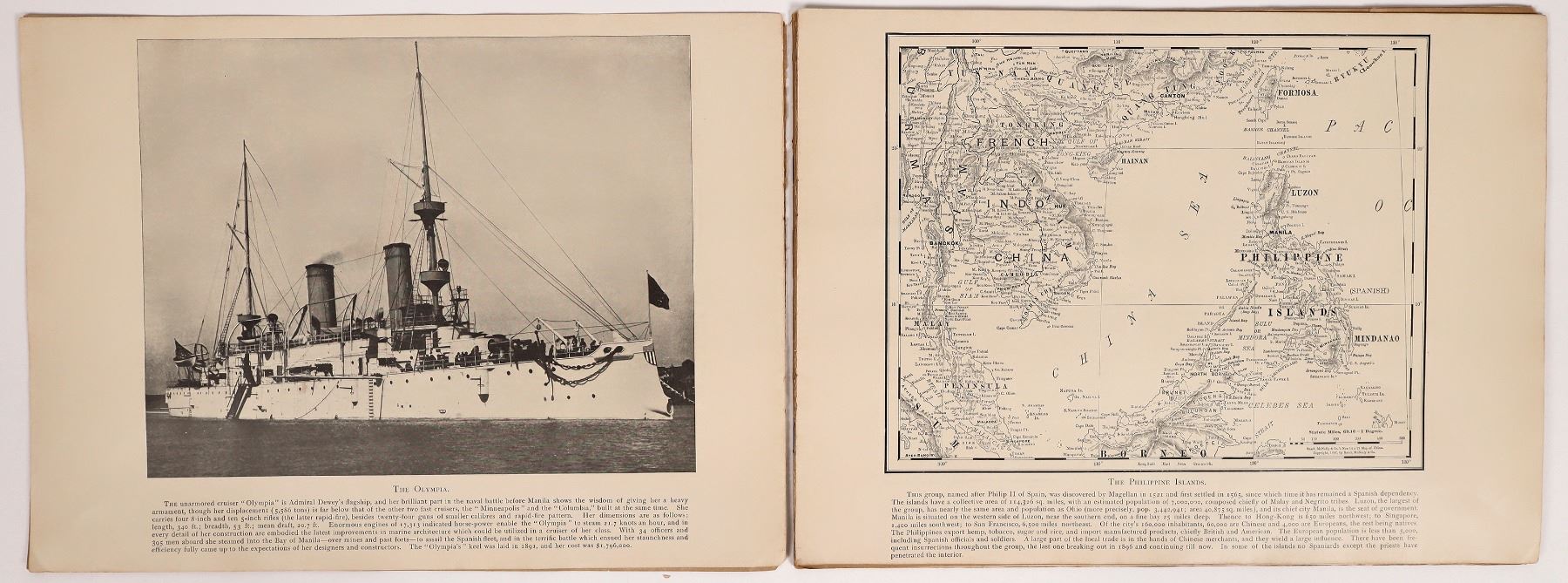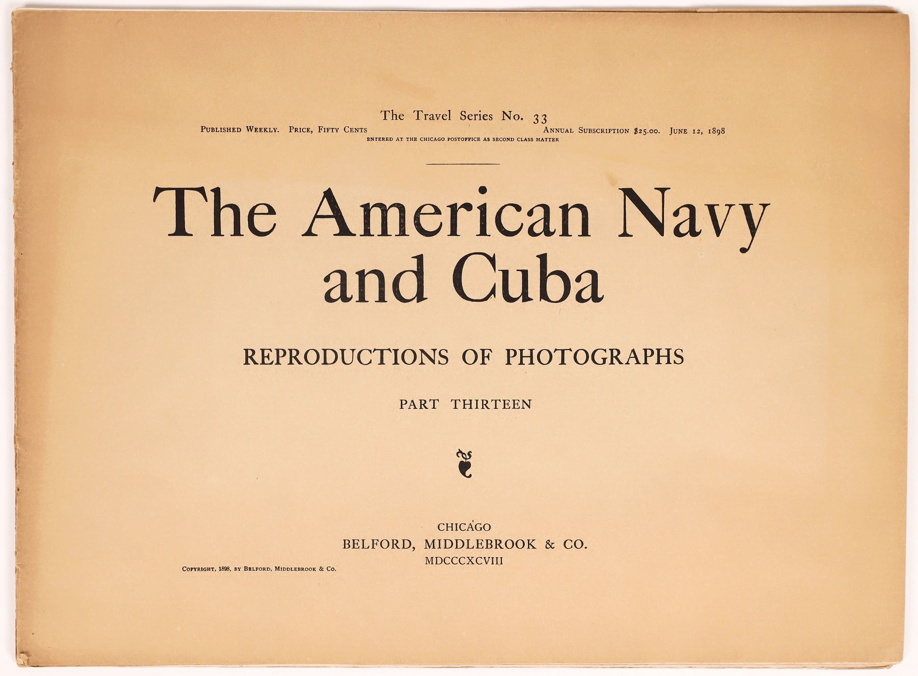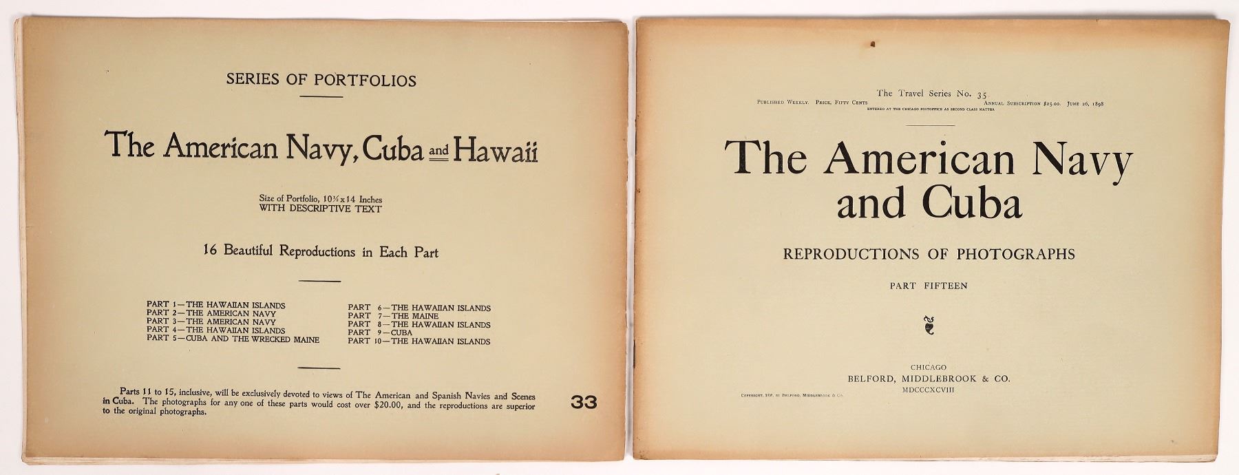 Lot of 2 different of a series by Belford, Middlebrook & Co., 1898. Part Thirteen and Part Fifteen. Spanish American War related. Full of black and white photographs of military ships, maps, and military officials like Admiral Dewey. 16 photo repros in each. 10.25 x 14" Toning to covers, one cover is detaching.