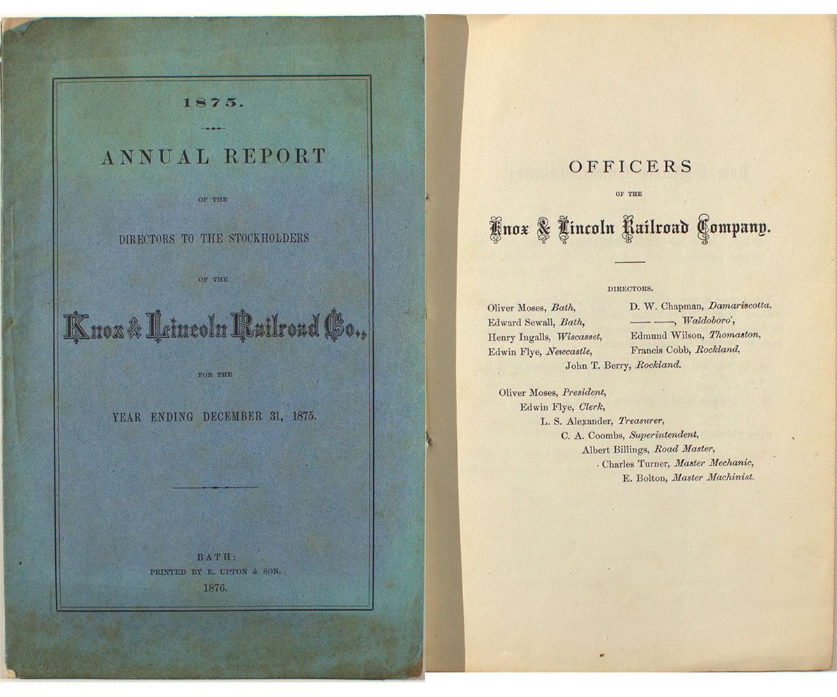 Booklet. Railroad ran fromBath to Rockland, Maine and connected with the B & M and the Maine Central. 20 pages. 5 1/2" x 9" Some discoloration and wearing on cover.