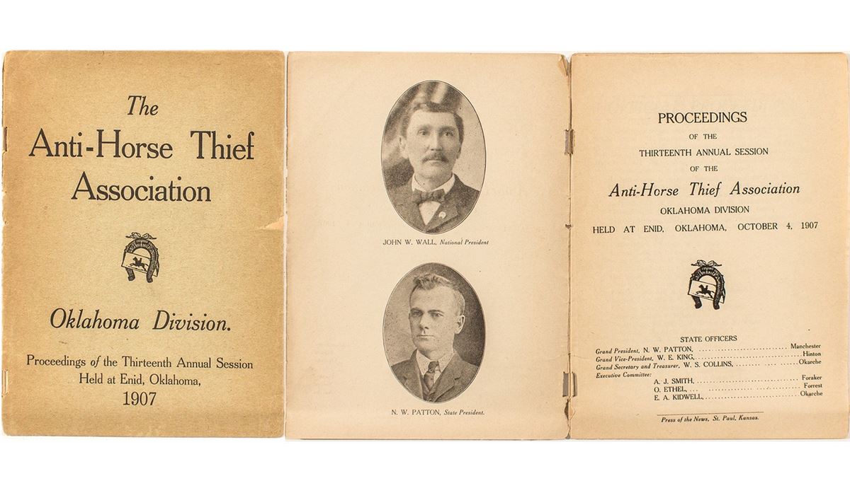 Proceedings of the Thirteenth annual Session of the Anti-Horse Thief Association, Oklahoma Division. Held at Enid, Oklahoma, October 4, 1907. Includes official proceedings and official roster. (7.5" x 5.5") 12 pp. Pamphlet is in very fragile condition, foxing on cover.