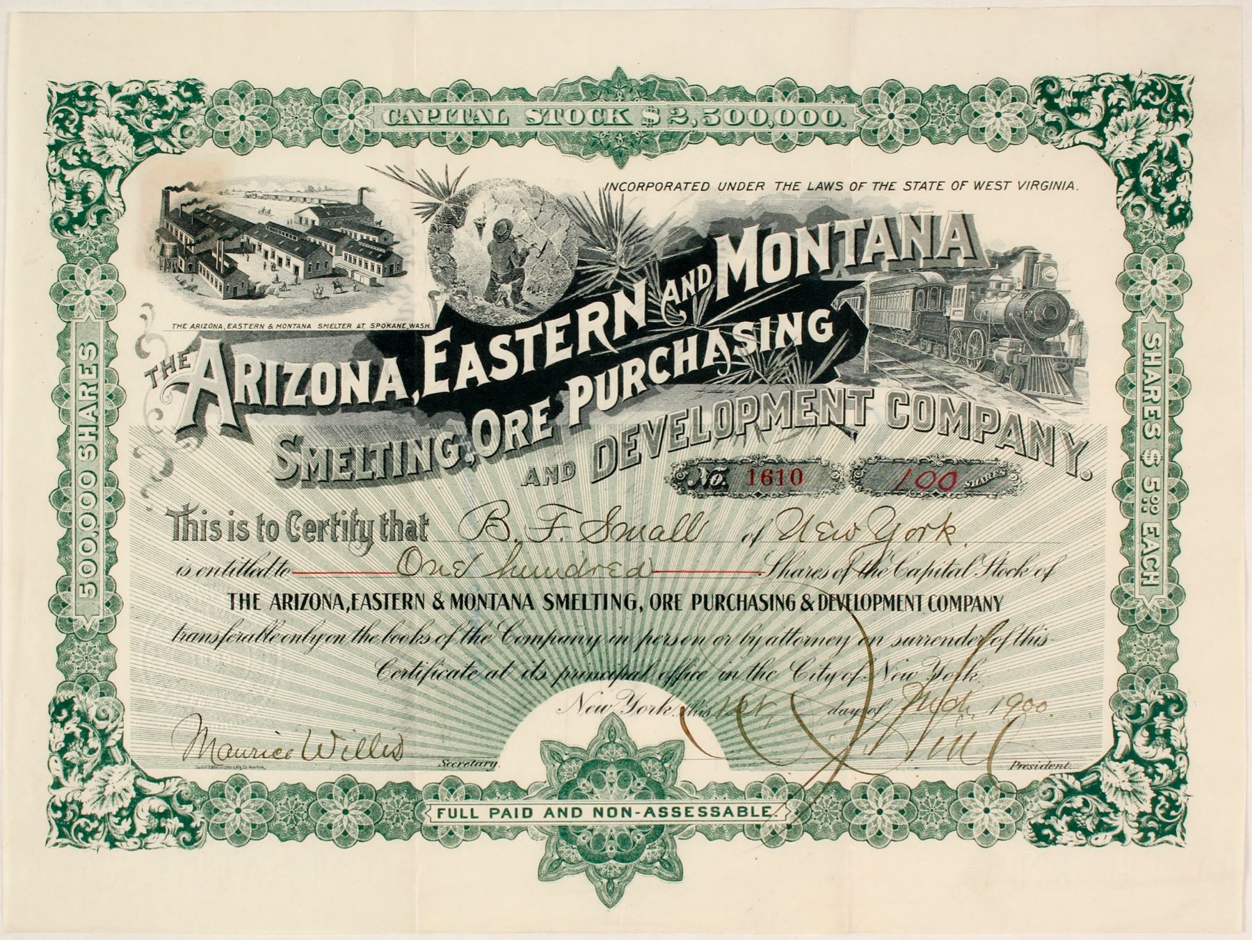Swindle! Inc. in West Virginia. No. 1610, issued for 100 shares to B.F. Small on March 1st, 1900. Signed by the president and secretary (Willis). Not cancelled. Large, very attractive certificate with ornate logo and three vignettes: locomotive (upper right), miner (center) and smelter facility at Spokane (upper left). Pinholes, folds, very fine. 9.5 x 13" According to the Copper Handbook (Vol. 10), the company was a swindle promoted by Dr. R.C. Flower who was arrested in 1904, escaped, and then caught in 1907. State: Arizona Al Adams Collection. HWAC# 59039