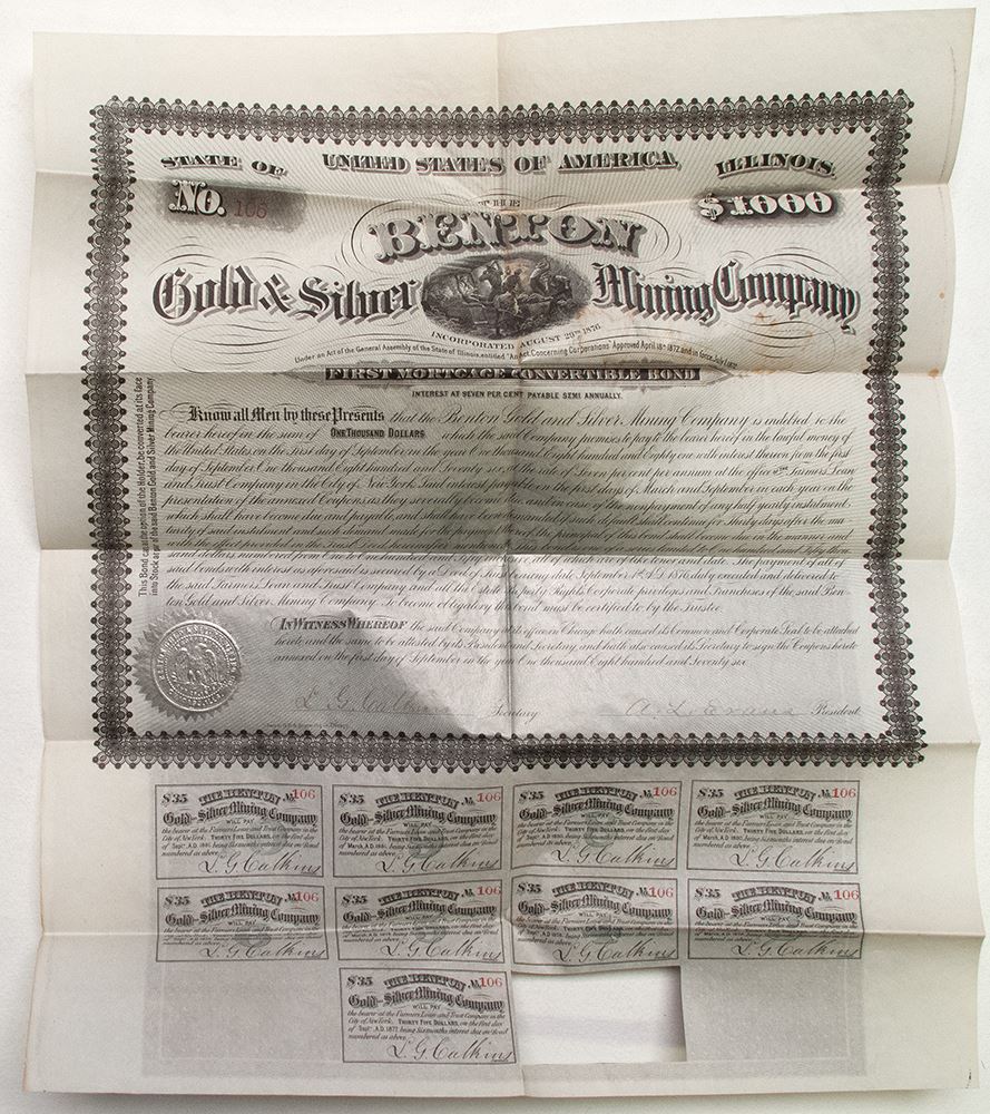 Black print with black ornate border and silver under print and seal. Mining vignette top center. Some water staining. Western B.N. & Engraving Co.