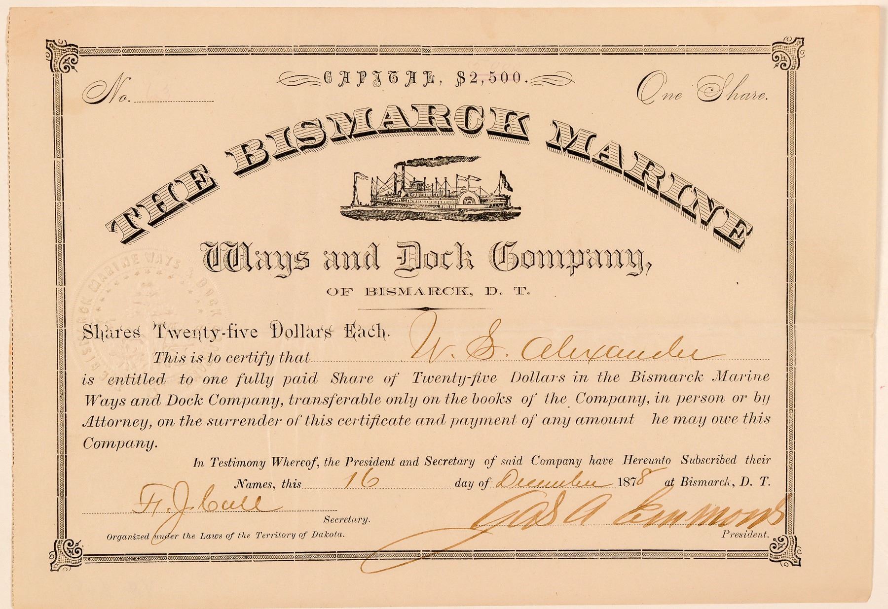 "of Bismarck, D.T." Organized under the Laws of the Territory of Dakota (printed at bottom left). No. 63 (very faint), issued to W.S. Alexander on December 16th, 1878. Signed by the president (Jas. A. Emmons) and secretary (F.J. Cull). Not cancelled. Black border and print. Vignette of paddle steamer. 6.25 x 9" Deep horizontal fold. Light wear. Rare Dakota steamer stock! () Ken Prag Collection