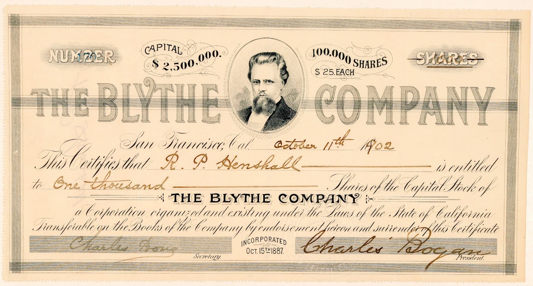 Unique. Inc. Oct. 15th, 1887. No. 170, issued for 1,000 shares to RP Henshall on Oct. 11th, 1902. Signed by president Charles Bogan and secretary. Not cancelled. Gray border and print. Portrait vignette of Thomas Henry Blythe. 5.25 x 10.25" Folds, pinholes. After San Francisco real estate tycoon Thomas Henry Blythe died suddenly, the collective heirs of the Blythe estate formed themselves into a company called the Blythe Company with a capital stock of $2,500,000 divided into 100,000 shares of $25 each. The purpose of the company was to avoid any possible delays or complications should one of the claimants die while the court was deciding the case. () Ken Prag Collection