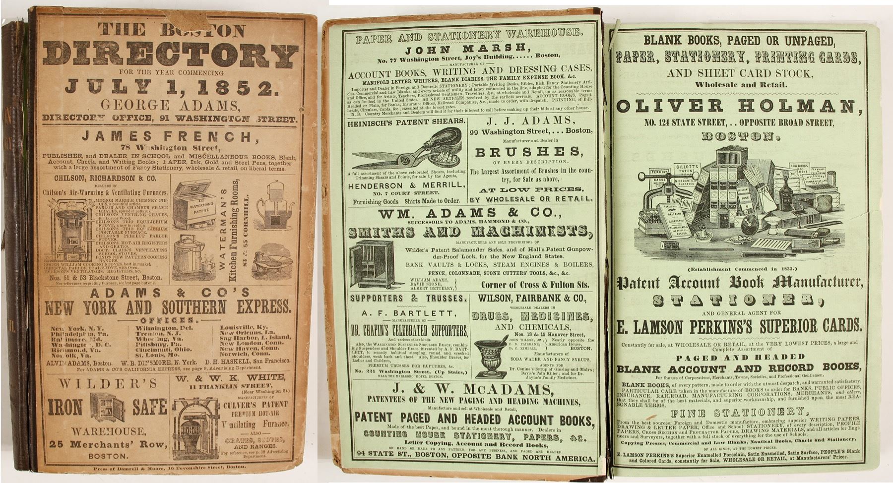 The Boston Directory for the Year 1852 with an Almanac, Boston, published by George Adams, 1852. Several sections in the back. The main body is 316 pages plus the appendix plus the ads. Rear cover board is separated at inside cover otherwise nice.
