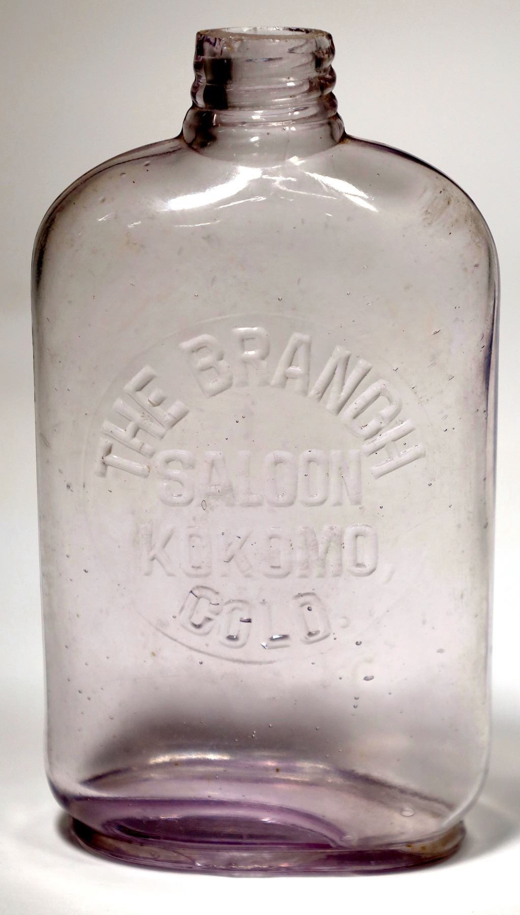 Preble W-103. The Branch / Saloon / Kokomo, / Colo. Pocket flask. Light purple tint. Ground top. Small chip on lip, scratches, bubbles. 5.5" At midnight on July 5th, 1898, the Branch Saloon, owned by Joe Bryant, was held-up by two masked men. They emptied the register, safe, and took two quarts of whiskey. Kokomo is now a ghost town in Summit County, Colorado. [Ref: The Colorado Daily Chieftain, July 6, 1898]