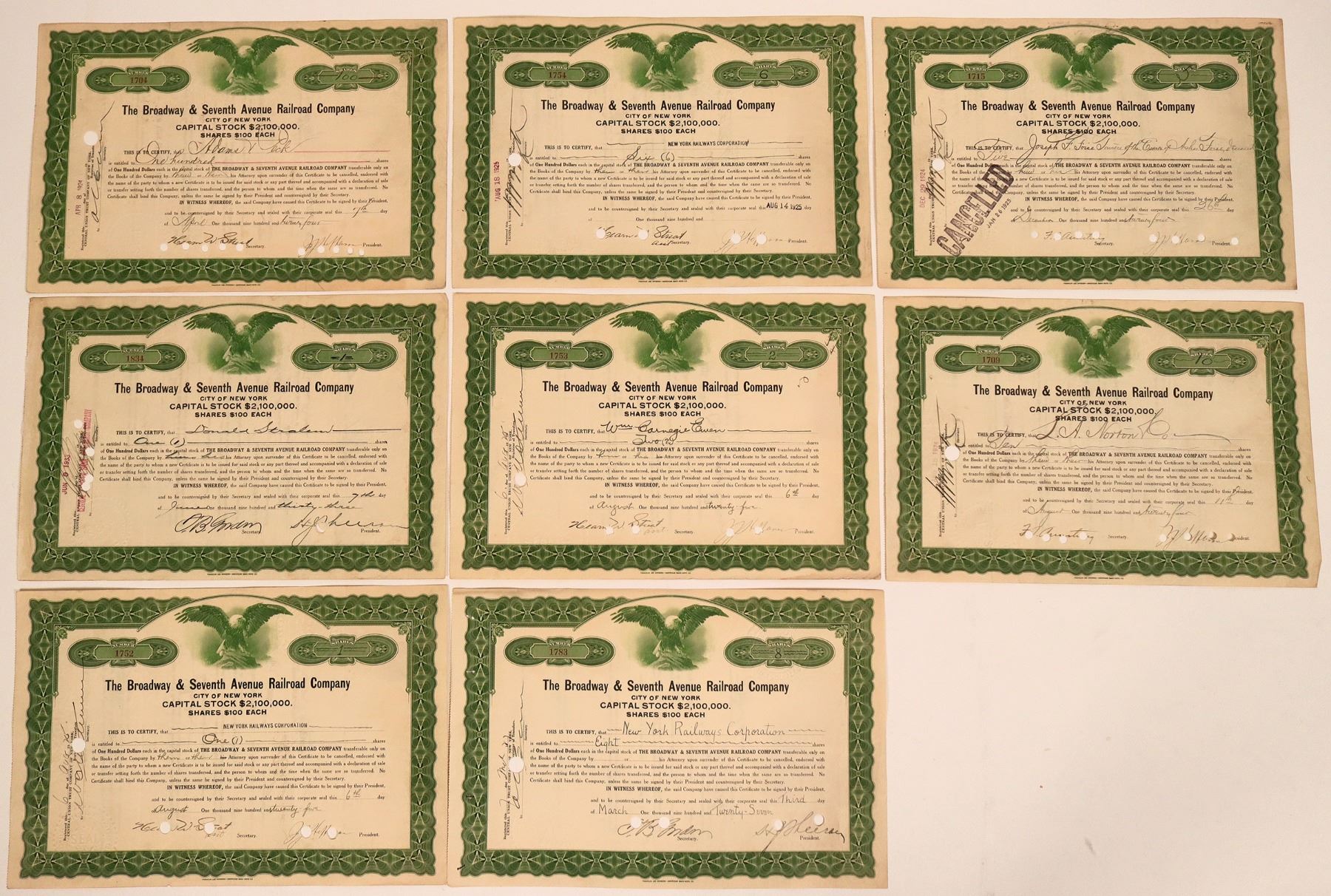 7 certificates. The Broadway & Seventh Avenue Railroad Co.incorp on May 26, 1864. Company opened a line from Lower Manhattan to Central Park in 1864. I/C, Green, embossed seal, eagle vignette, lots of revenue stamps. Franklin Lee Division-American bank Note Co. VF.