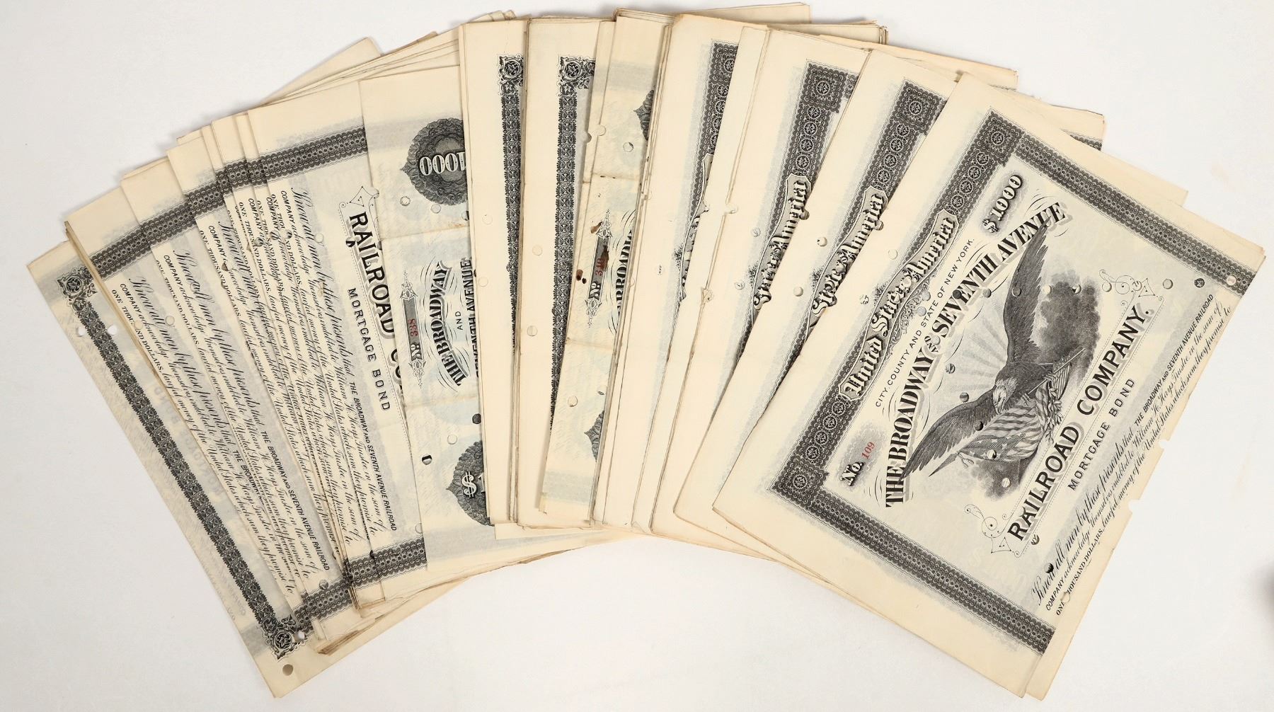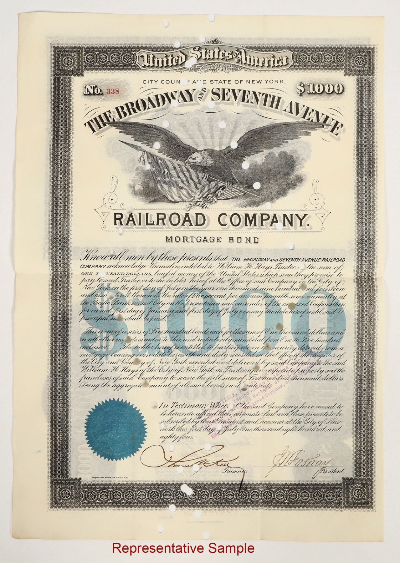 Approx.50. Al I/C. Issued 1884. Heavy hole punch. The Broadway and Seventh Avenue Railroad Co., $1000, 5% bearer bonds. City, County and State of New York. Henry Seibert & Bros. printers.