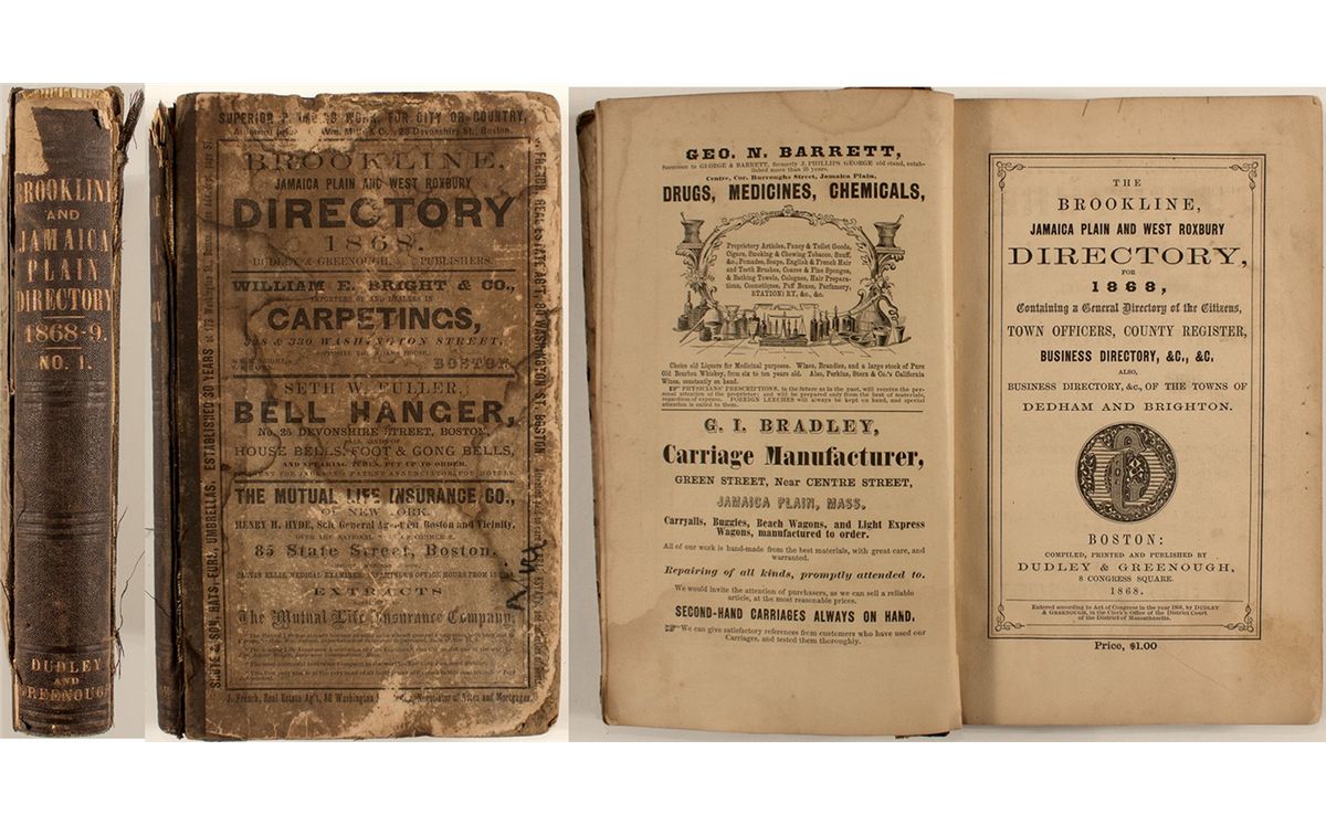 The first Brookline Directory. Compiled and published by Dudley & Greenough. “…containing a general directory of the citizens, town officers, county register, business directory, etc., etc. Also, business directory, etc. of the towns of Dedham and Brighton.” Seventy pages of illustrated advertisements! Table of Contents. Includes business directories for three aforementioned cities and Brighton and Boston. Historical sketch by Dean Dudley. Brookline has long been regarded as a pleasant and verdant environment. In the 1841 edition of the Theory and Practice of Landscape Gardening, Andrew Jackson Downing described the area this way: “The whole of this neighborhood of Brookline is a kind of landscape garden, and there is nothing in America of the sort, so inexpressibly charming as the lanes which lead from one cottage, or villa, to another.” Once belonged Harvard College Library. Covers show great wear: paper separating from cover, well-worn edges, starting to detach from spine, etc. 204 pages plus 70 pages of advertising. [Rarity: i]City: BrooklineCounty: State: MADate: