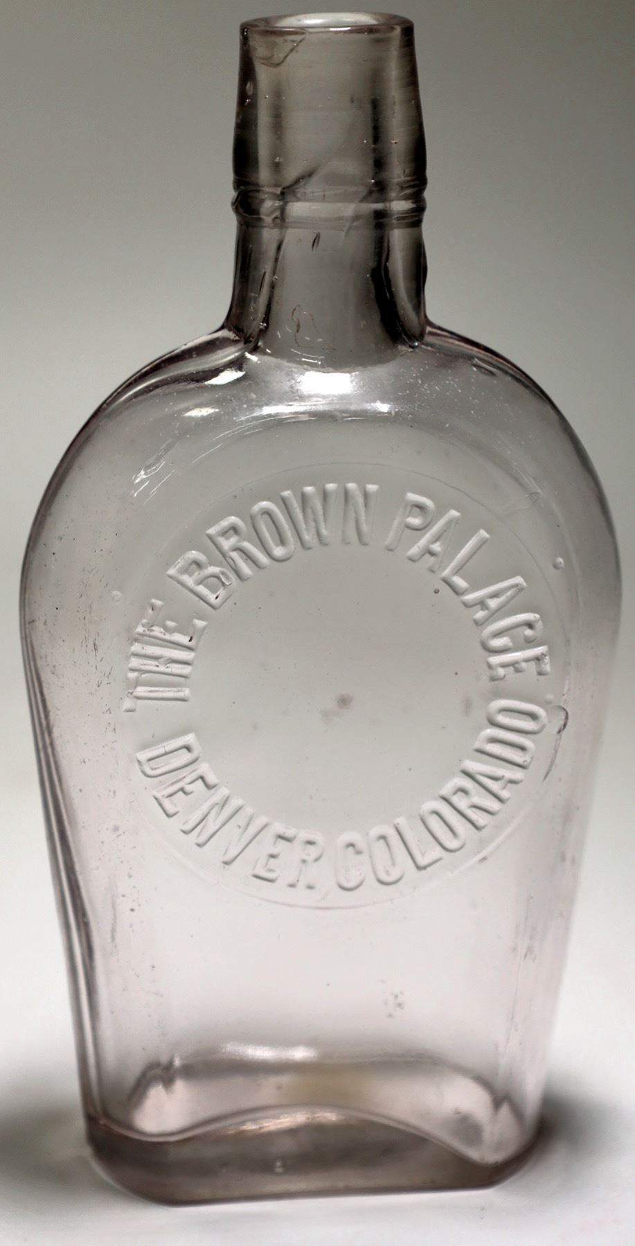 W29 in Preble, c. 1895-1905, half pint shoofly. A gem. This whiskey flask is from the world-famous Brown Palace Hotel of unsinkable Molly Brown fame whose money came from Johnny and Molly's silver claim in Leadville. She survived the sinking of the Titanic.
