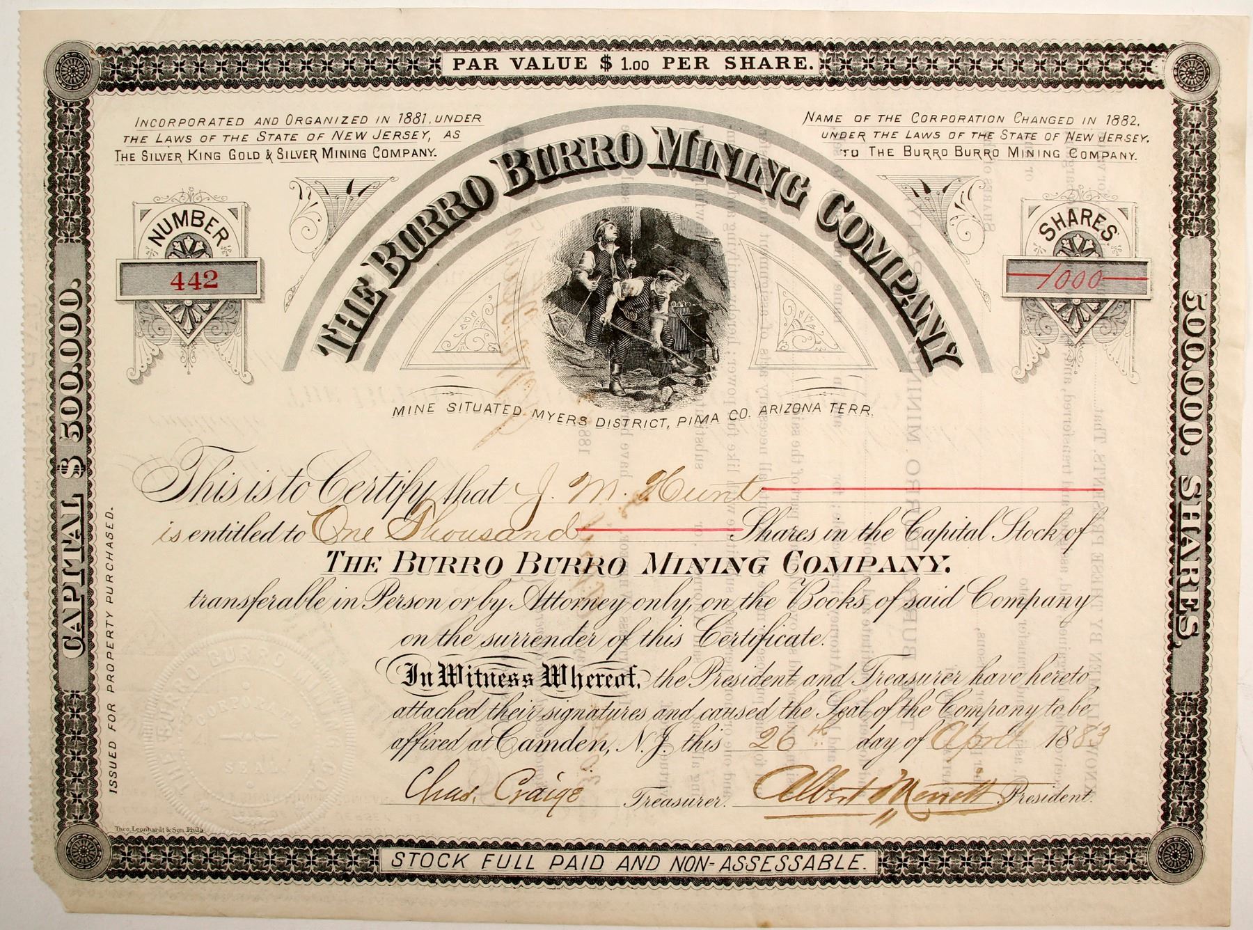 Incorporated in 1881 in New Jersey as the Silver King Gold and Silver Mining Co.; changed the name in 1882 to Burro Burro. Certificate number 442 issued to JM Hunt for 1000 shares in 1883. Signed by President Albert Merritt and Treasurer Chas. Craige. Torn bottom left corner. Upper left corner fold. What appears to be staple holes upper left. Still a find looking cert. Printed by Theo. Leonhardt & Sons, Phila. Small vignette top center of two miners working underground. Uncancelled. Black border and print on white paper.8 x 10. Tenney (1927, p. 123) reports that this mine was acquired by a Philadelphia company in 1883 under the management of C. R. Craige. A small smelter was built, but was shutdown due to faulty construction after making only one run. It appears unlikely that the company recovered, or if it did, made little production from the property. The Arizona Bureau of Mines reported in 1974 that the Gunsight mine was the only major producer of metal from the district. A spectacular document with pressed seal. Prag Collection