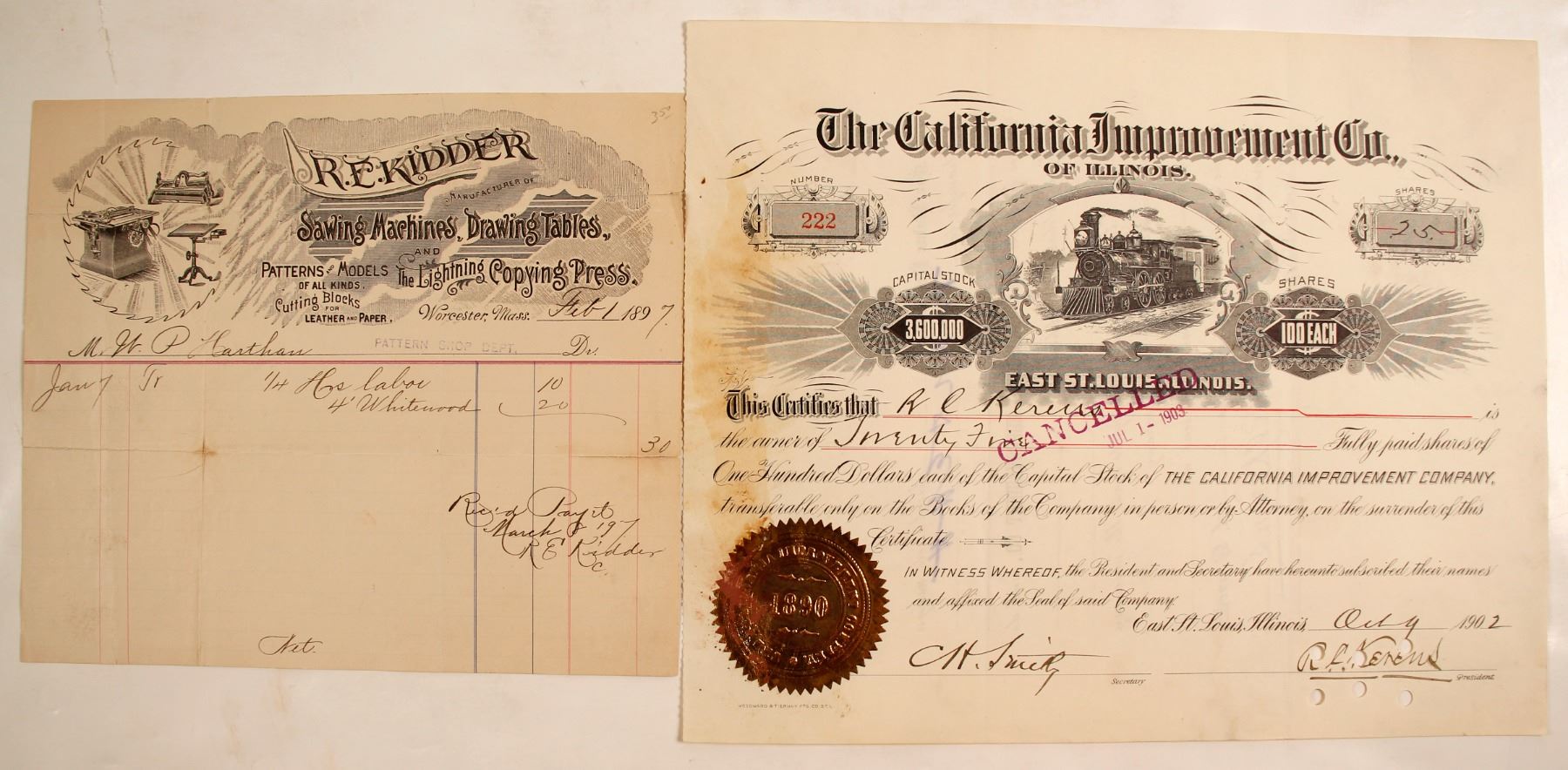 1) Cancelled on July 1, 1903 Capital Stock from The California Improvement Co., of Illinois. Stock number 222, 25 shares with seal and signature.