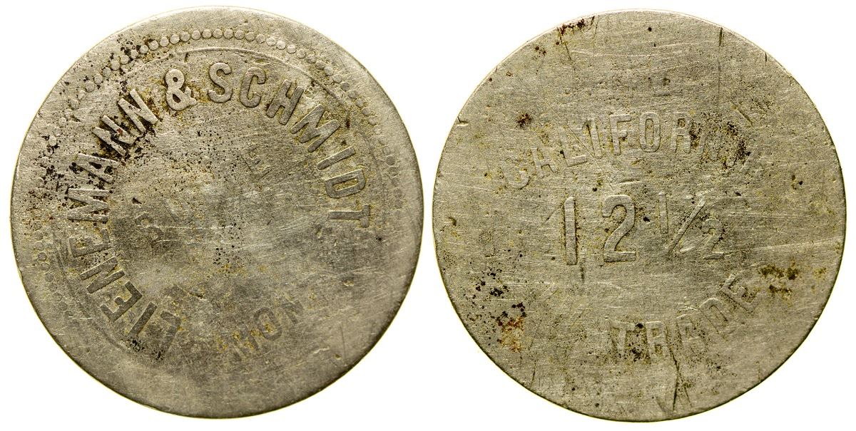 Lienemann & Schmidt / Butte / City / Mont. // The / California / 12 1/2c / IT. Aluminum, very worn, 25mm. (Svoboda Collection) City: Butte City State: Montana Date: HWAC# 35007