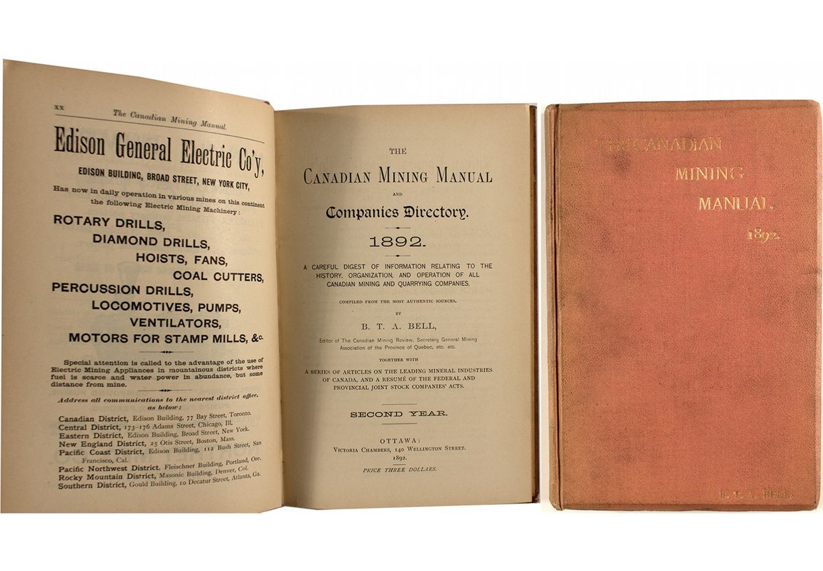Bell, B.T.A.; The Canadian Mining Manual and Companies Directory; 1892; Victoria Chambers, Ottawa. 266pp, 51pp advertisements; 6 x 9"; pink boards, gilt lettering front and spine. slight wear. Great ads for mining goods of all kinds and services. Most are illustrated. Bell produced this important Canadian directory for the Canadian department of agriculture. The first 72pp discuss the various mining industries in Canada (gold, coal, industrial minerals) and the history of the Nova Scotia and Quebec gold fields. Mining regulations and the stock regulations are present. Following that is a 247pp alphabetical listing of the Canadian mining companies. The listings show corporate officers, location, capital and sometimes the production. Rare.City: County: State: CANDate: 1892