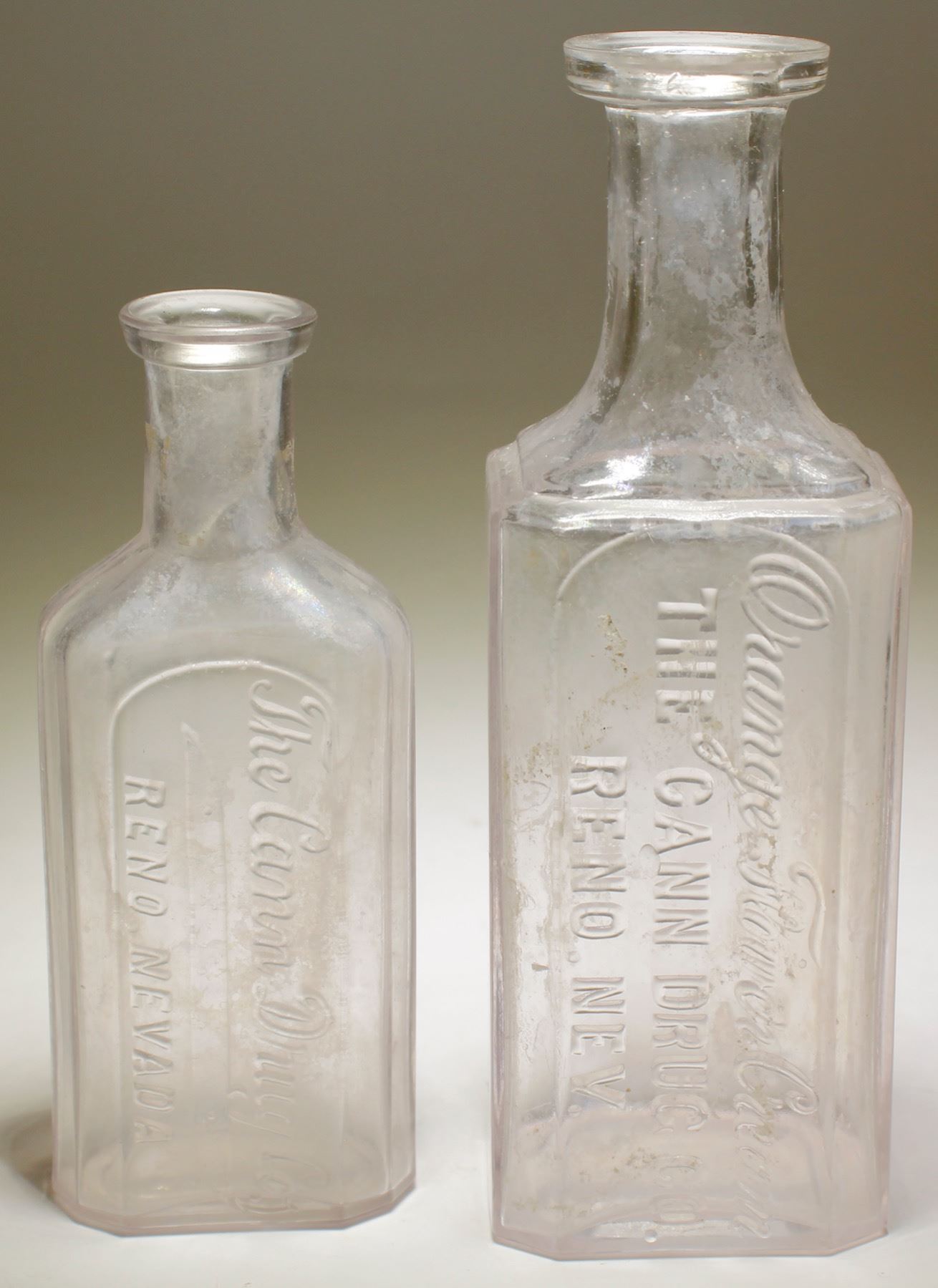 Item #1 of 2 : The Cann Drug Co/ Over Banner / Reno, Nevada / : Base: W.T & Co ( Au) / U.S. A. ( Ad) // Clear, square collar top, tooled lip. 4 3/8" , good condition, except for light haze. Item#2 of 2 : Orange Flower Cream ( In Script) / The Cann Drug Co. /Reno, Nevada. // Base: W.T. & Co / U.S.A.// Clear, square collar lip, tolled top and 5 5/' tall. Damaged, large 3/8" chip out of the right rear corner, and two small bruises. Probably, in making , cause i don't see any impact. Also, a little haze. Nice looking pair, despite the damage.( RH).. State: Nevada City: Reno Date: 1898-1910 HWAC# 61447