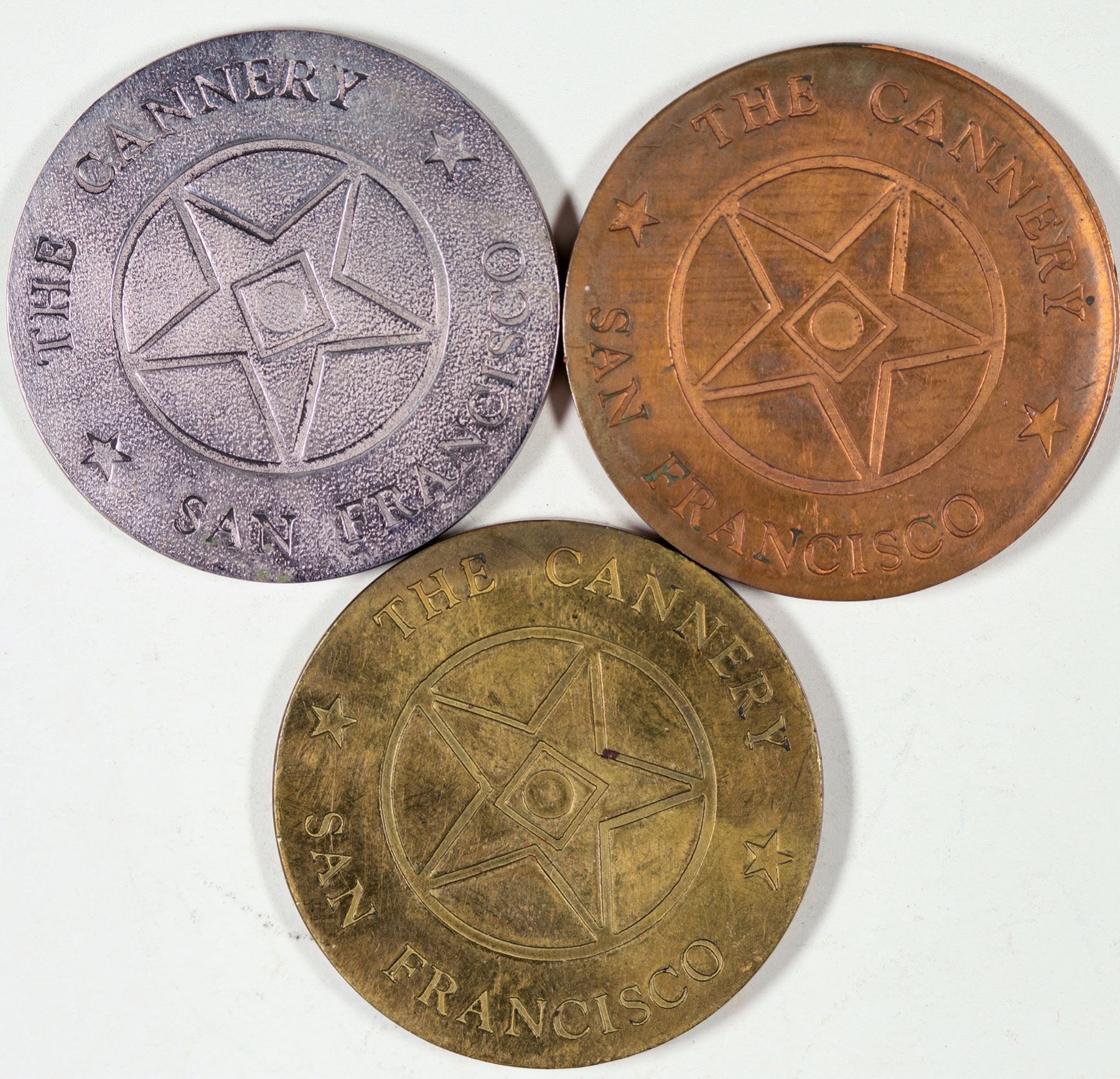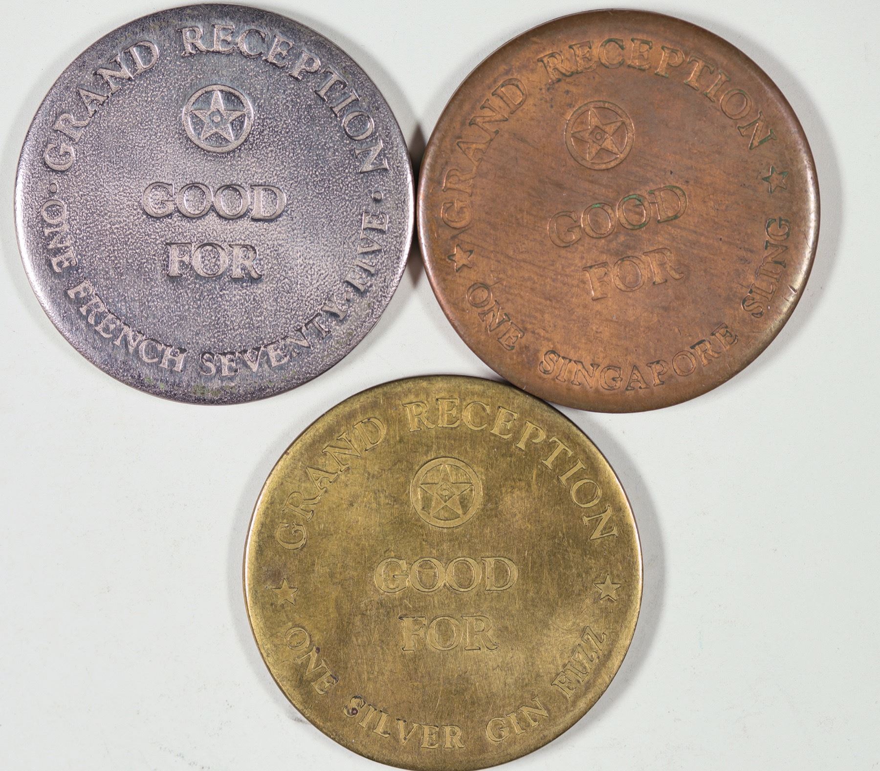 Set of three different 41 mm round metals: obv.: The Cannery / San Francisco; rev.: Grand Reception / Good For / (copper) One Singapore Sling / (brass) One Silver Gin Fizz / (white metal) One French Seventy-Five. Ex Ron Lerch Collection.