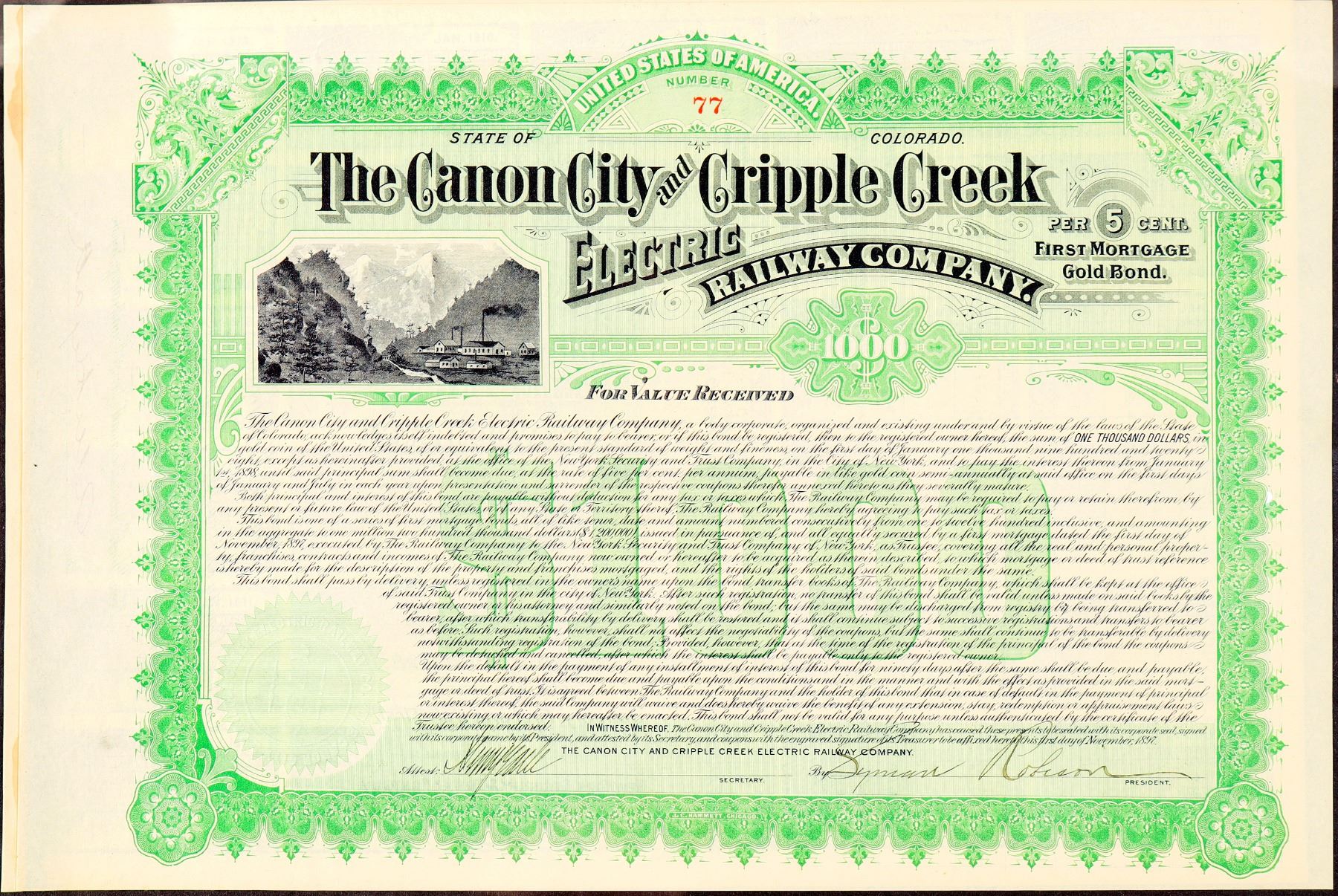#77 of 1200, $1000 5% 30 year First Mortgage gold bearer bond due 1928. Issued Nov 1, 1897 signed Syman Robison President, GREE, embossed seal, vignette town next to creek mountains in background, "$1000' green underprint, all coupons attached, J.C. Hammet printer. AU Cond. Ken Prag Collection