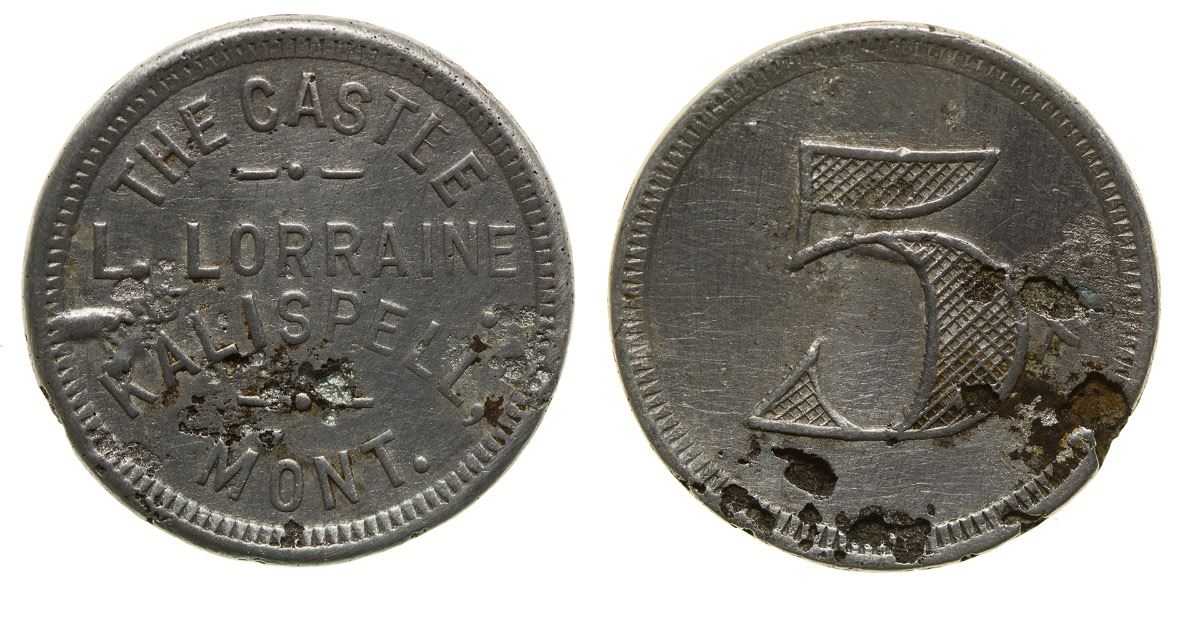 The Castle / L. Lorraine / Kalispell / Mont. // GF / 5c / IT. Round, aluminum, 24mm. (Svoboda Collection) City: Kalispell State: Montana Date: HWAC# 35814