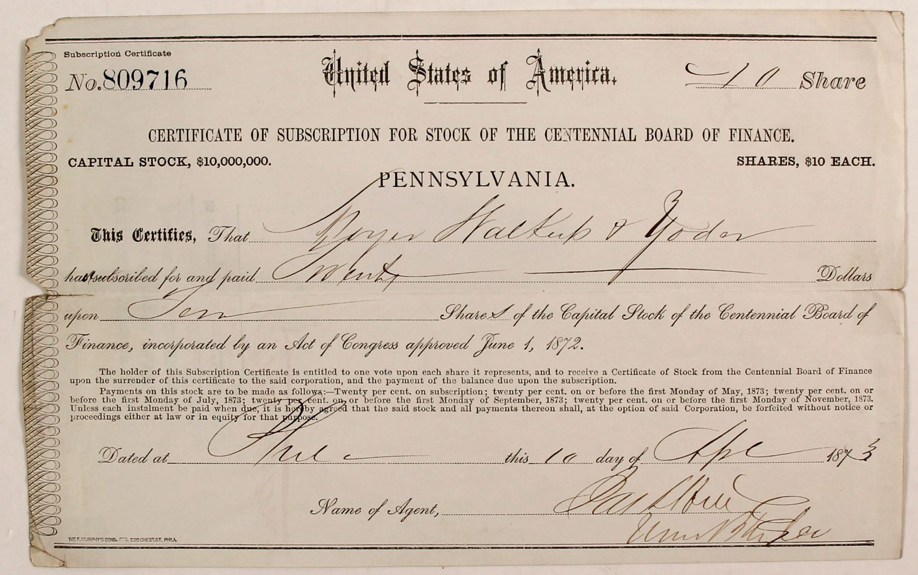 incorporated act of Congress June 1, 1872 United States of America Cert. of Subscription. Cert # 809716 for 10 shares of common stock @ $10 per share issued to illegible signed 10 April 1873 agent illegible, blue, Printer Wm. F Murphy & Sons PRS. 509 Chest St Phila., comes w/ article about Phila. Centennial Exposition, both in fine cond. iu