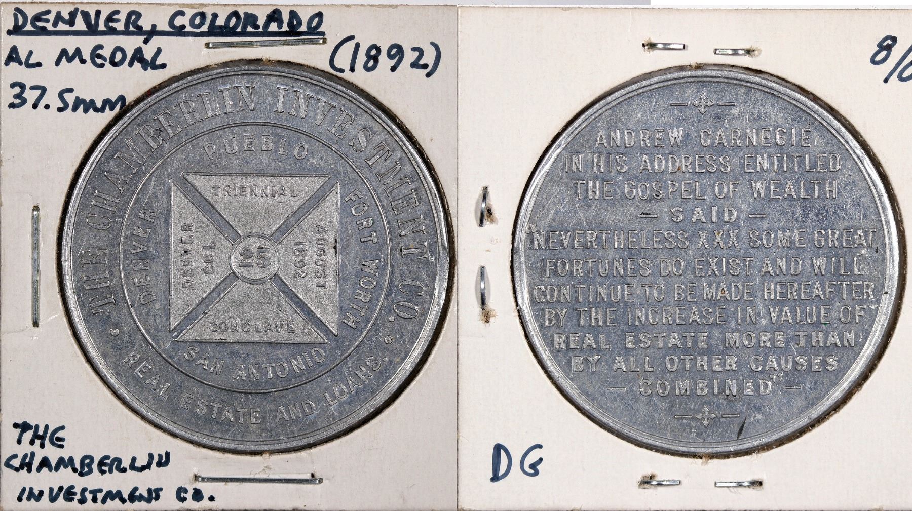 The Chamberlin Investment Co. / Real Estate and Loans /Denver / Pueblo / Fort Worth /San Antonio; Rev.: Andrew Carnegie/ In HIs Address Entitled / The Gospel of Wealth / Said / Nevertheless XXX Some Great / Fortunes Do Exist and Will / Continue To Be Made Hereafter / By The Increase In Value Of / Real Estate More Than / By All Other Causes / Combined. Al., rd., 38 mm.
