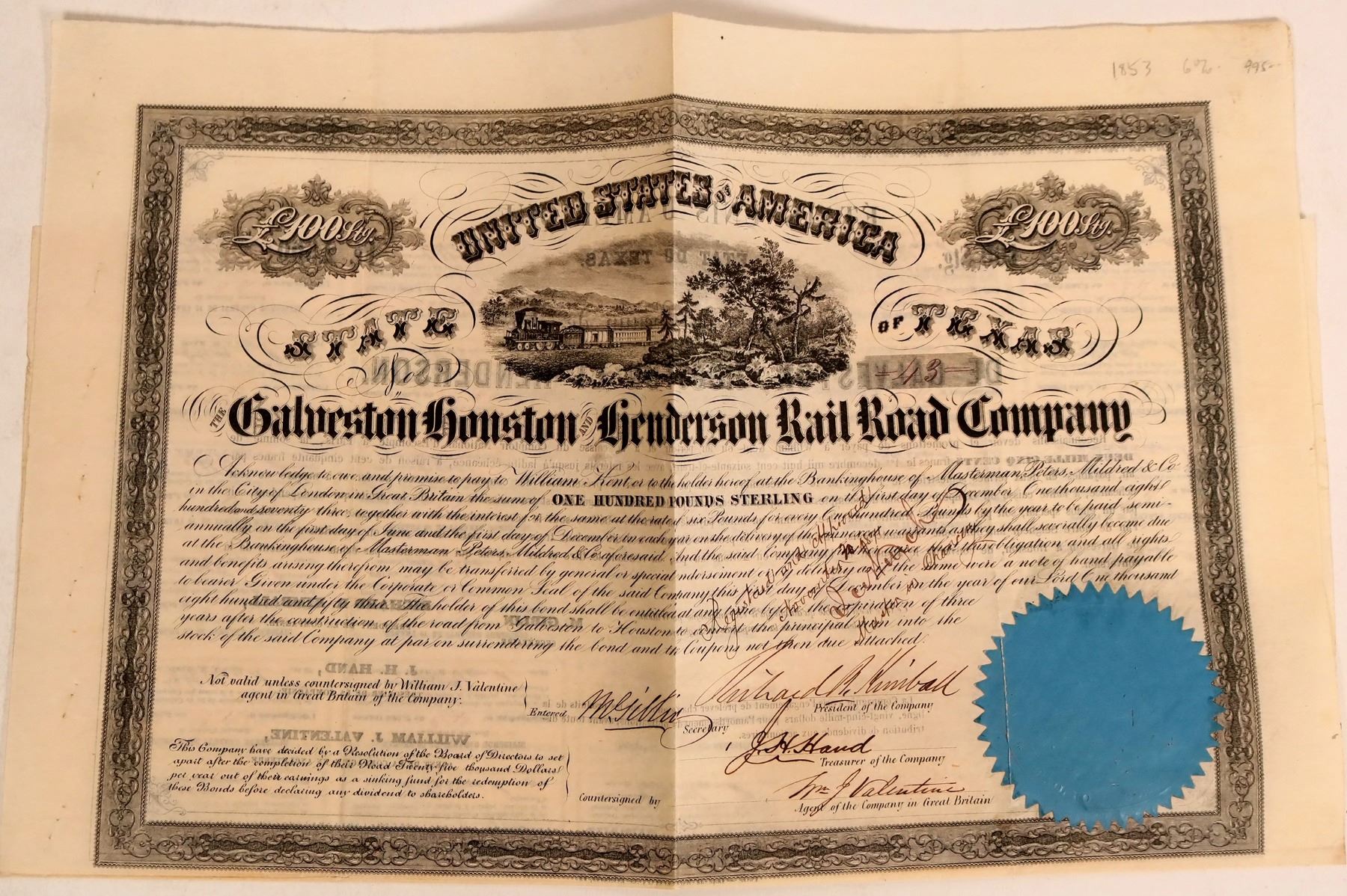 Chartered on February 7, 1853, to build from Galveston through Houston to Henderson. It was, for a number of years, Galveston's only rail connection with the Texas railroad system centering at Houston, financing was provided by investors in Holland and France. #43, I/U, !00 LBS sterling 6% issued Dec 1, 1853 signed Richard B. Kimball President, Black, Blue seal, vignette 4-4-0 trees in foreground, 30 coupons attached, French language n back. Unknown printer. EF